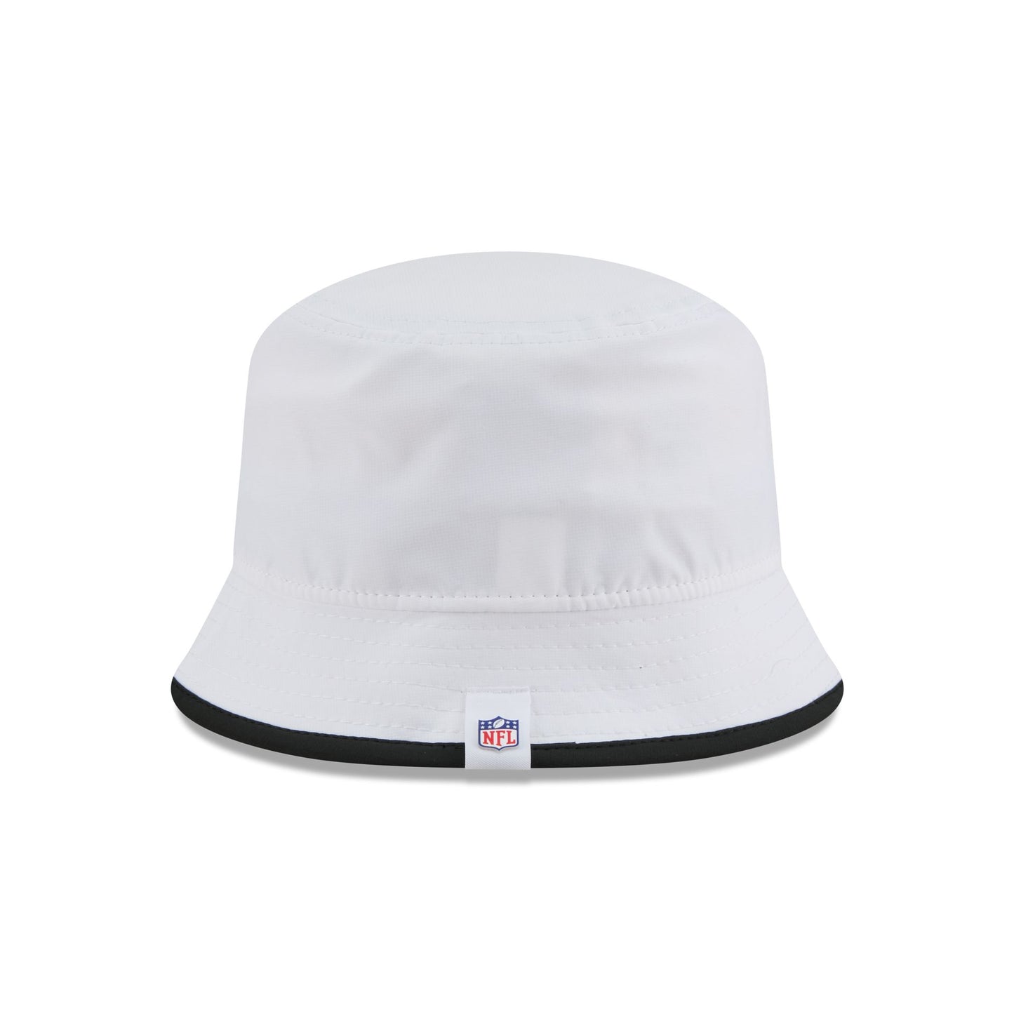 The Pittsburgh Steelers 2025 Training Bucket Hat features a silicone Steelers patch at the front panel with team color piping along the edge and a silicone NFL Shield patch on a woven foldover tab at the rear.