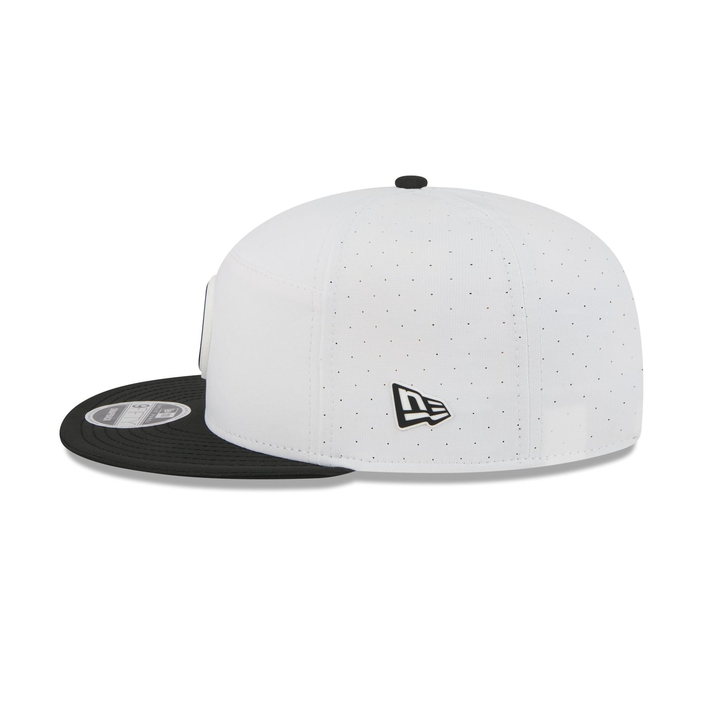The Pittsburgh Steelers 2025 Training Split Panel 9FIFTY Snapback features a silicone Steelers patch at the front panel with team color stripes at the front of a black visor. Additional details include a silicone NFL Shield patch on a woven foldover tab above a snapback closure at the rear.