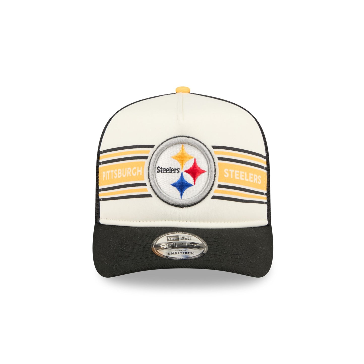 The Pittsburgh Steelers Banner 9FIFTY A-Frame Trucker features a embroidered Steelers logo at the front panels against a screen-printed stripe at the front panels. Additional details include a snapback closure at a mesh rear and a gray undervisor.