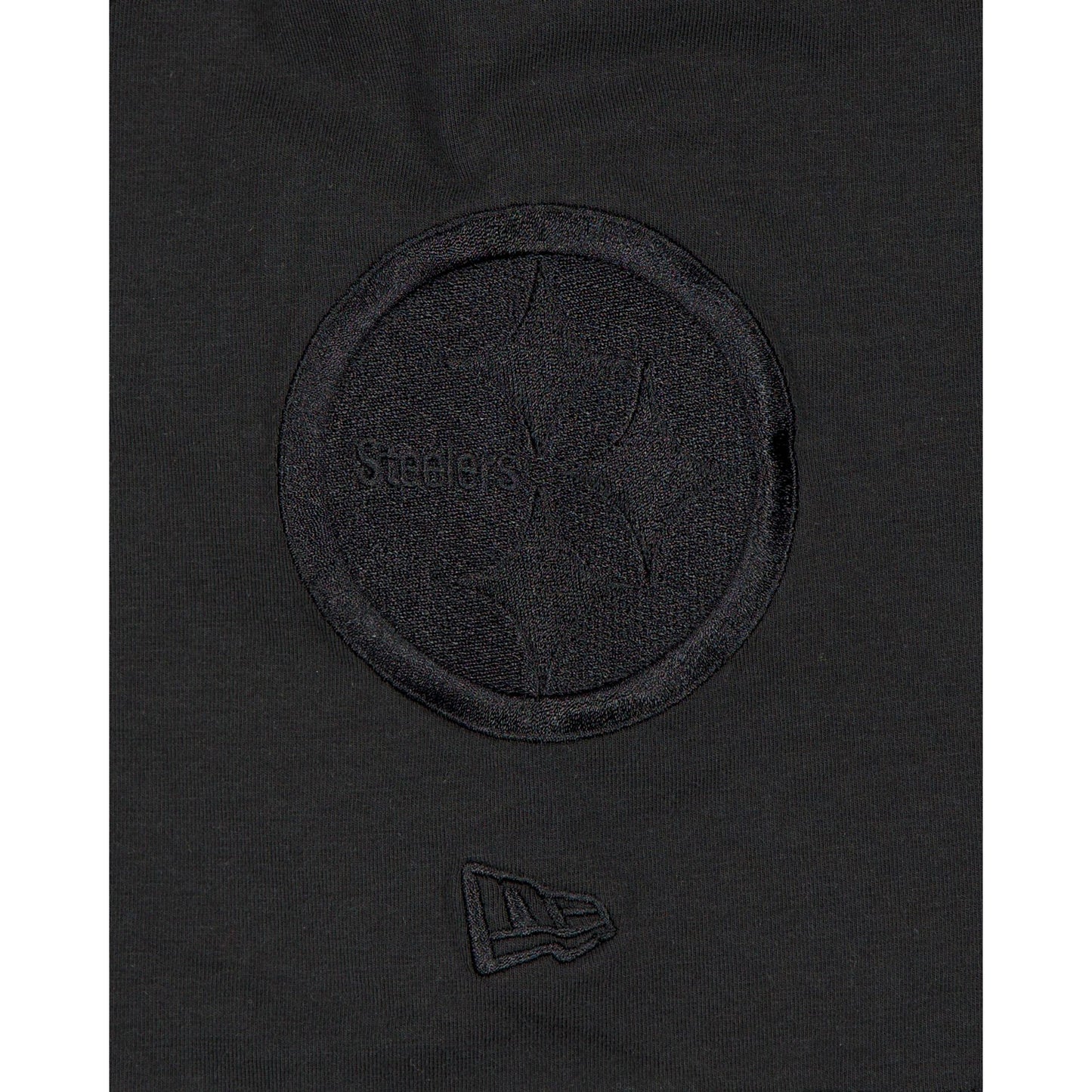 The Pittsburgh Steelers Black on Black Logo Select T-Shirt features a satin applique with a tonal stitch Steelers wordmark at the chest and an embroidered team logo at the left-wear sleeve.