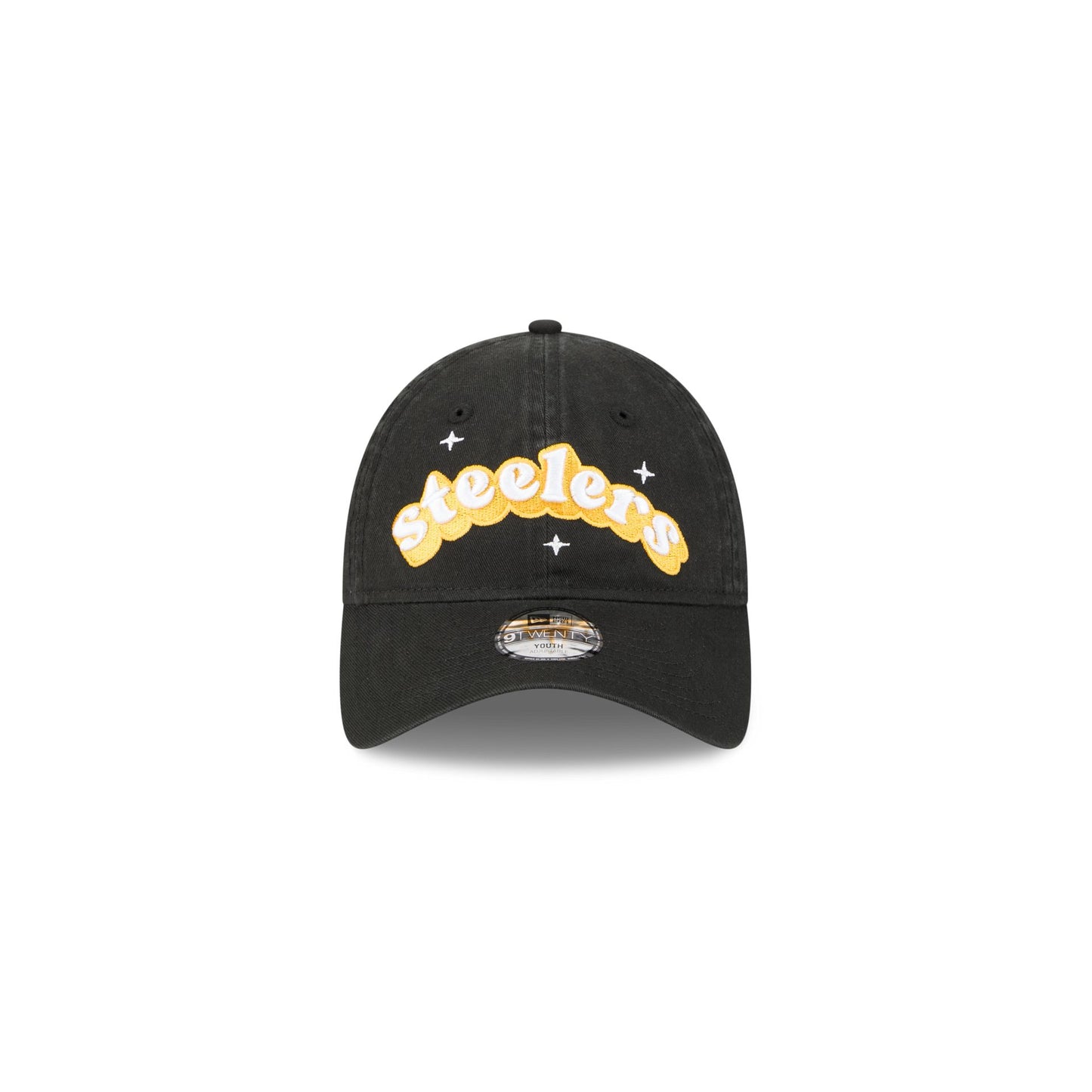 The Pittsburgh Steelers Cheer Kids 9TWENTY Adjustable Cap features an embroidered Pittsburgh Steelers sparkle wordmark at the front panels. Additional details include a logo at the right-wear side and an adjustable D-Ring closure at the rear and a gray undervisor.