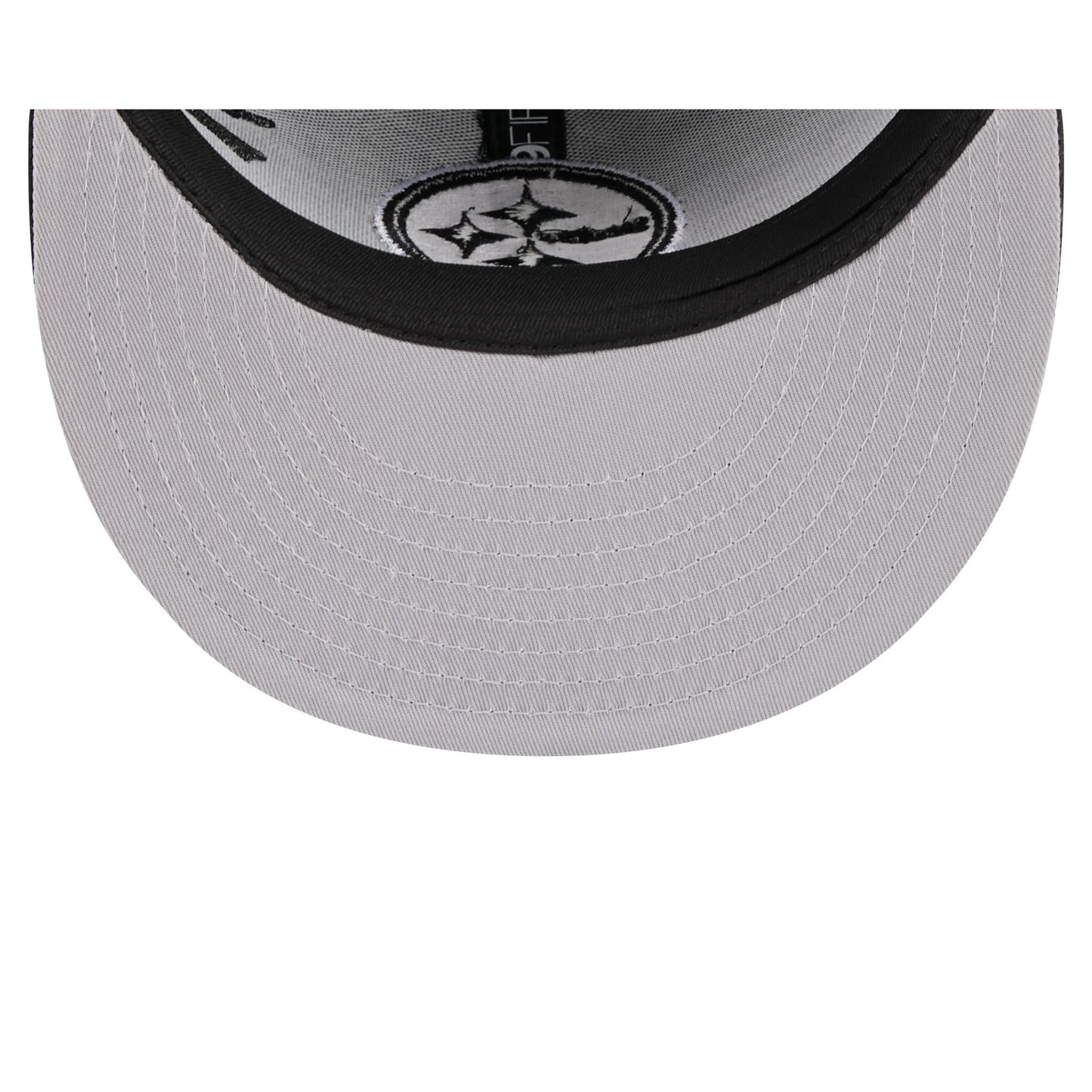 The Pittsburgh Steelers City Art 9FIFTY Snapback features an embroidered Steelers black and white logo at the front panels and an embroidered city banner with art at the right-wear side. Additional details include a snapback closure at the rear and a gray undervisor.