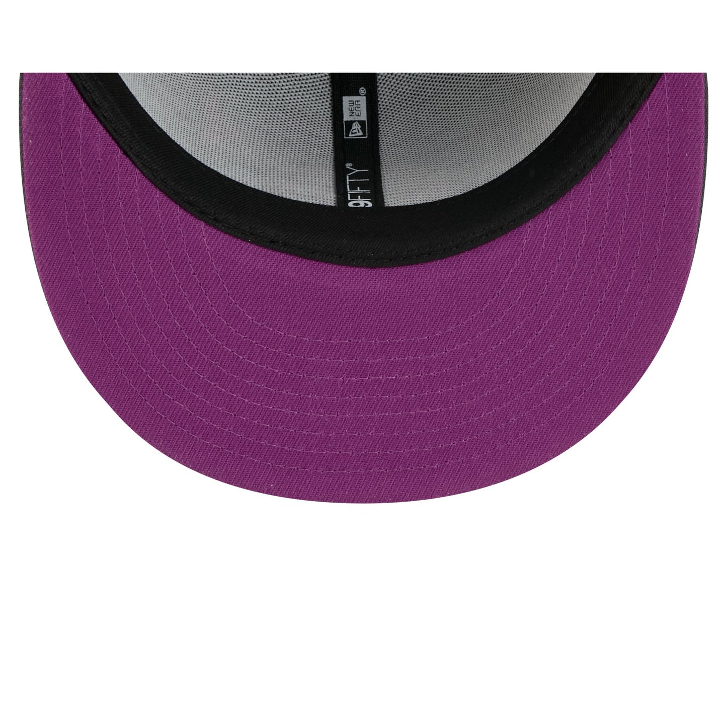 The Pittsburgh Steelers Day of the Dead Graphite 59FIFTY Fitted Cap features an embroidered Steelers logo at the front panels with marigold (cempasúchil) and hummingbird designs throughout, representing the Legend of Xóchitl and Huitzilin. Additional details include a team patch at the right-wear side and a matching NFL Shield logo at the rear.