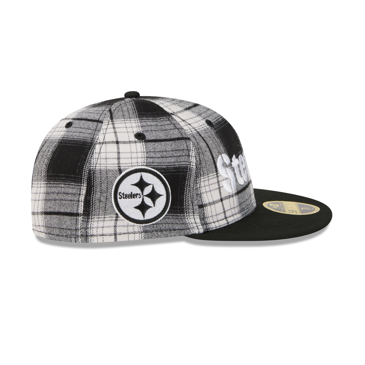 The Pittsburgh Steelers Grunge Plaid Retro Crown 59FIFTY Fitted Cap features an embroidered Steelers wordmark at the front panels with a matching NFL Shield at the rear, a team logo at the right-wear side, and a black undervisor.