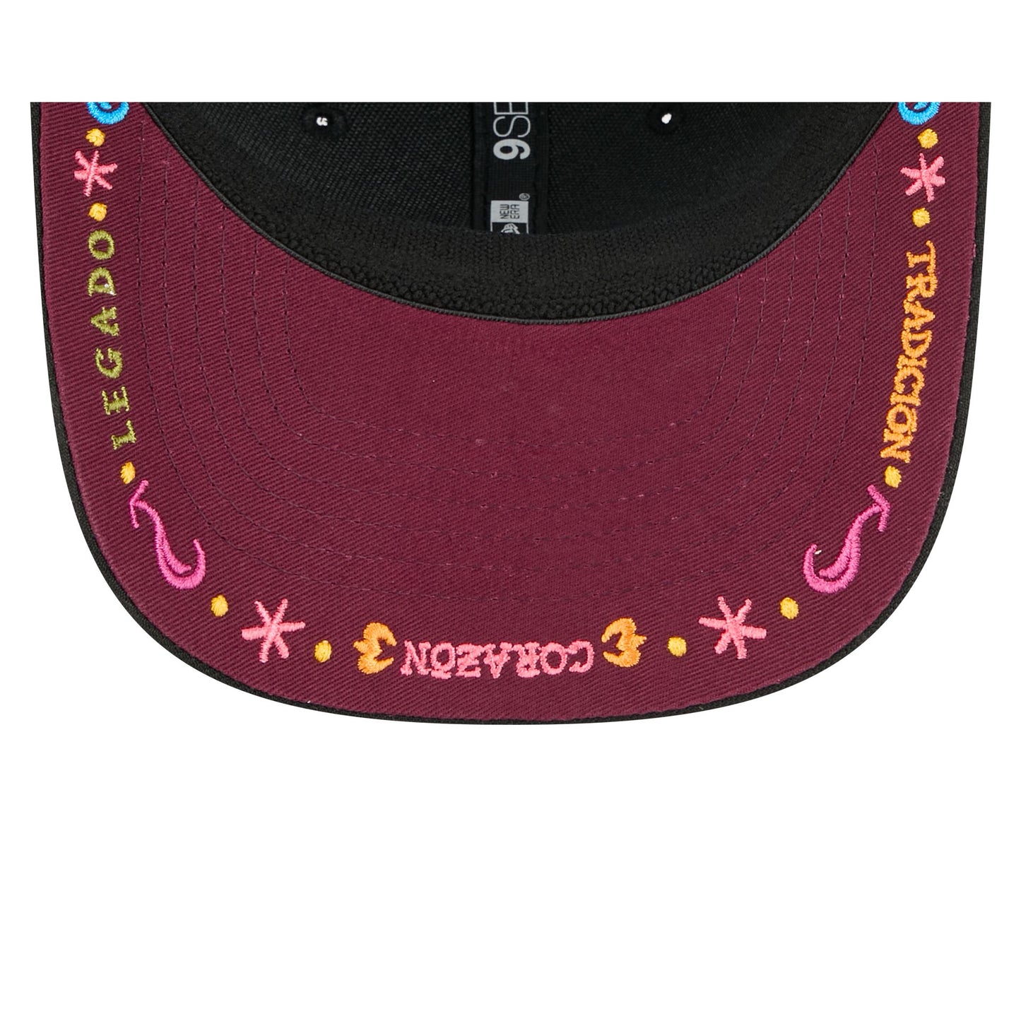 The Pittsburgh Steelers Hasta La Muerte 9SEVENTY Stretch-Snap features an embroidered Steelers logo and Day of the Dead design at the front panels. Additional details include design at the visor, and an undervisor that reads: Tradición, Corazón y Legado, meaning Tradition, Heart and Legacy. A matching NFL Shield is shown at the rear with an adjustable snapback closure.