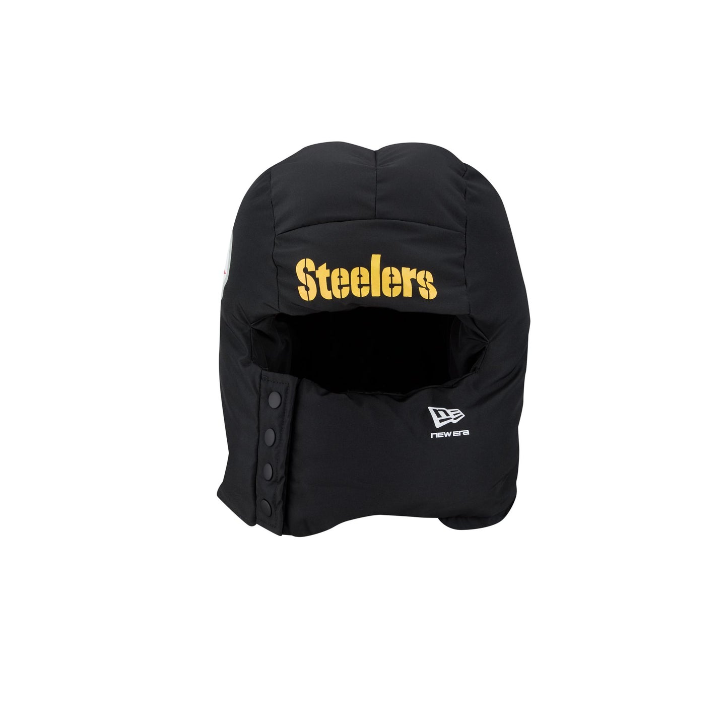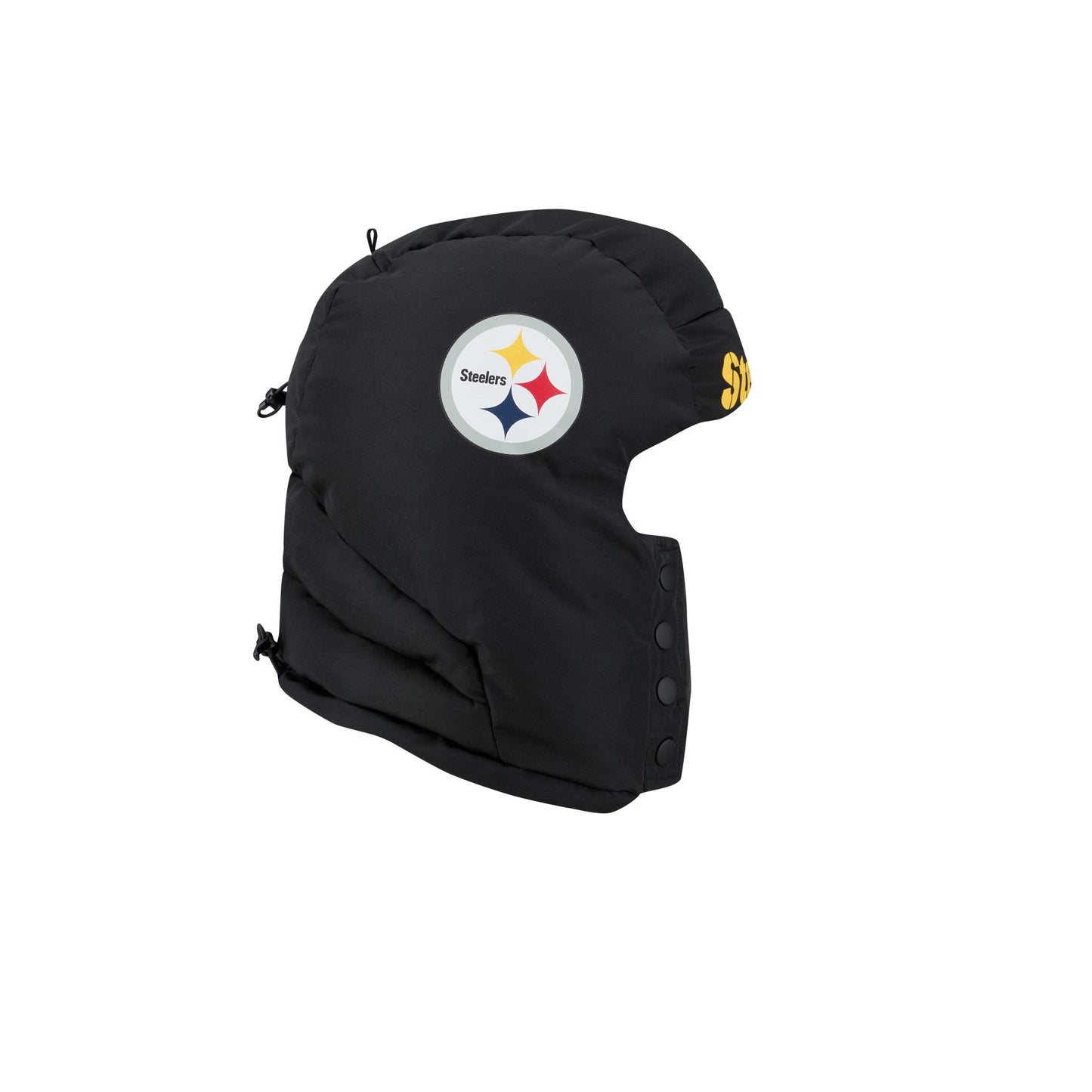 The Pittsburgh Steelers Helmet Puffer Hood features an embroidered Steelers wordmark at the front with a helmet design at each side. Additional details include an insulated filling with adjustable drawstrings at the back of the head and neck. The puffer helmet has a 4 snap-button closure at the right.