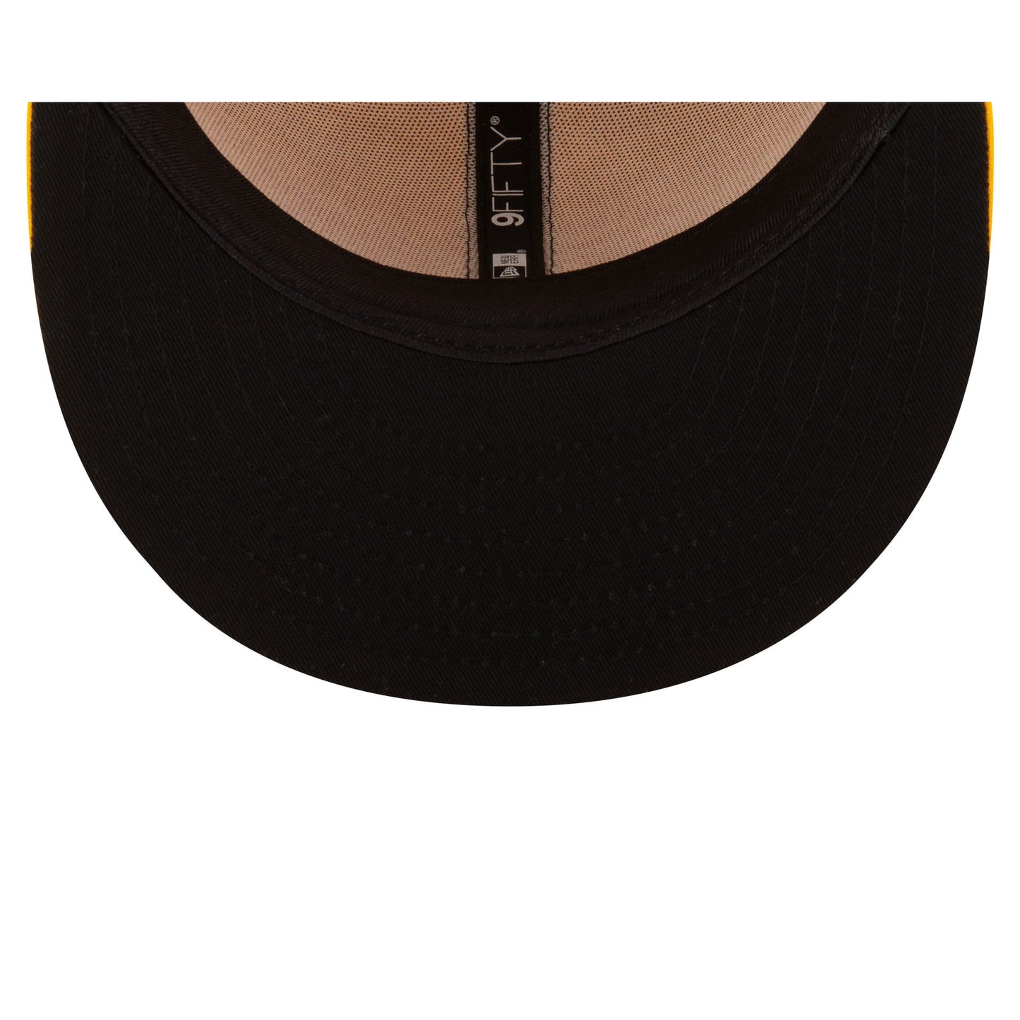 The Pittsburgh Steelers Historic Helmet Pack 9FIFTY Snapback features an embroidered fabric applique Steelers replica helmet design at the crown with a matching woven team logo tag at an adjustable snapback closure at the rear and a black undervisor.