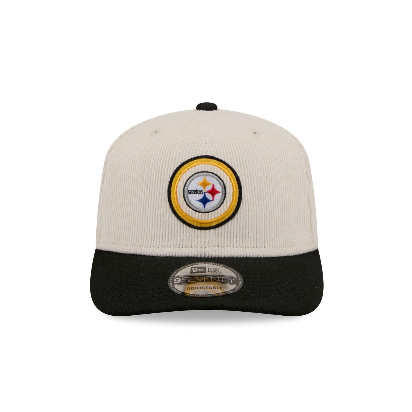 The Pittsburgh Steelers Loyal Corduroy 9SEVENTY Stretch-Snap features an embroidered Steelers logo at the front panels against a corduroy fabrication throughout the cap with an adjustable stretch-snap closure at the rear.