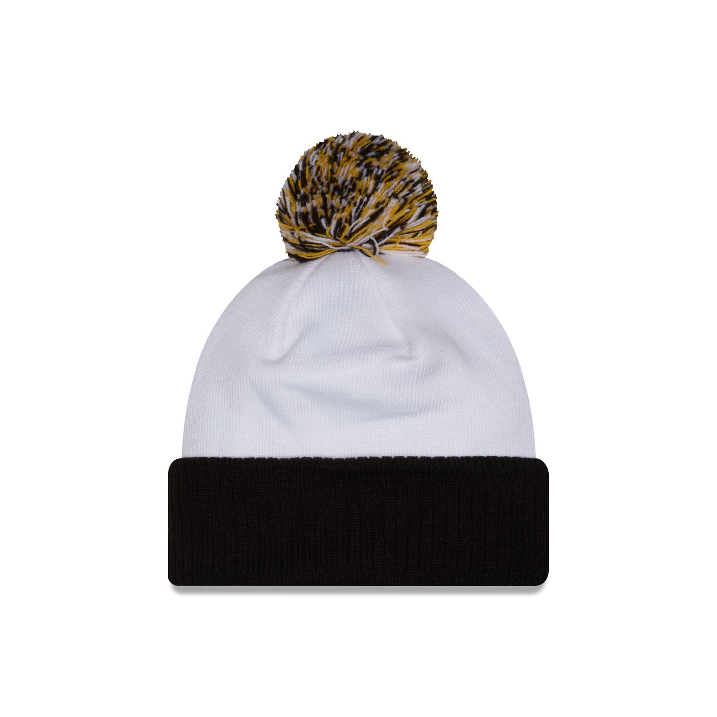 The Pittsburgh Steelers Spirit Pom Knit features a screen-printed Steelers Historic graphic at the crown with a one-time removable pom.