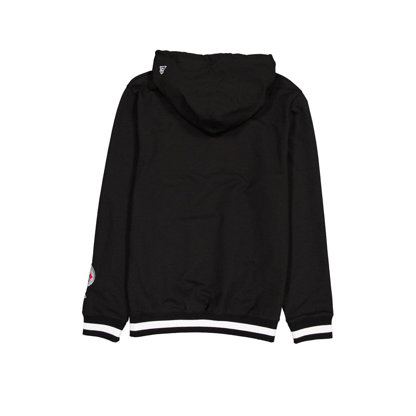The Pittsburgh Steelers Team Color Logo Select Hoodie features a zig zag stitched twill applique Steelers wordmark at the chest with a New Era Cap jock tag at the kangaroo pocket and an embroidered team logo at the left sleeve.