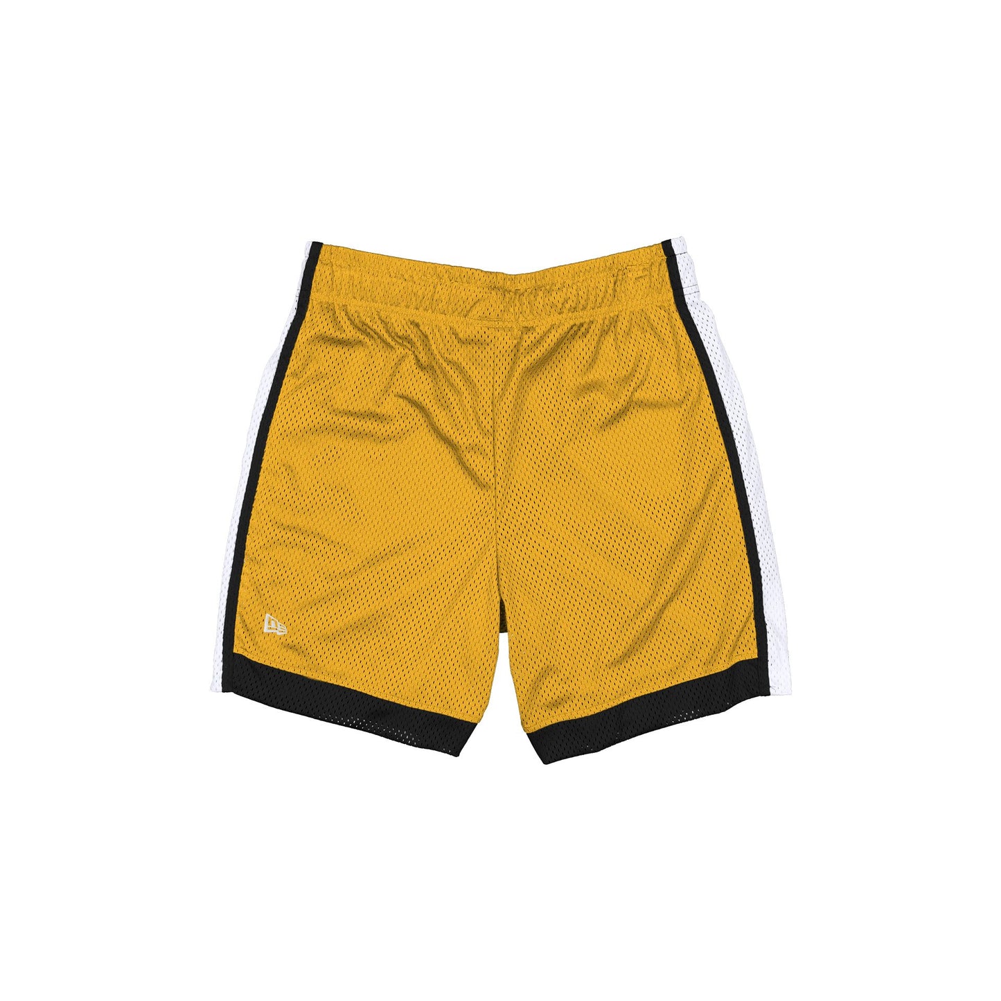 The Pittsburgh Steelers Team Color Summer Shorts feature an embroidered Steelers helmet at the left leg with front pockets and adjustable drawstrings at the waist. These shorts have an 8 inch inseam.