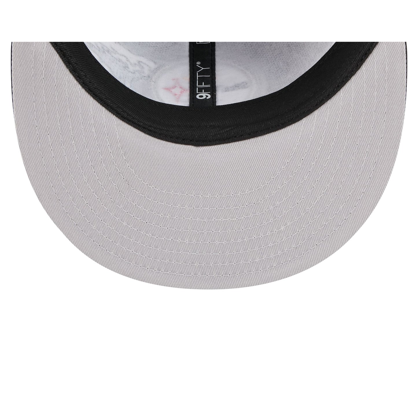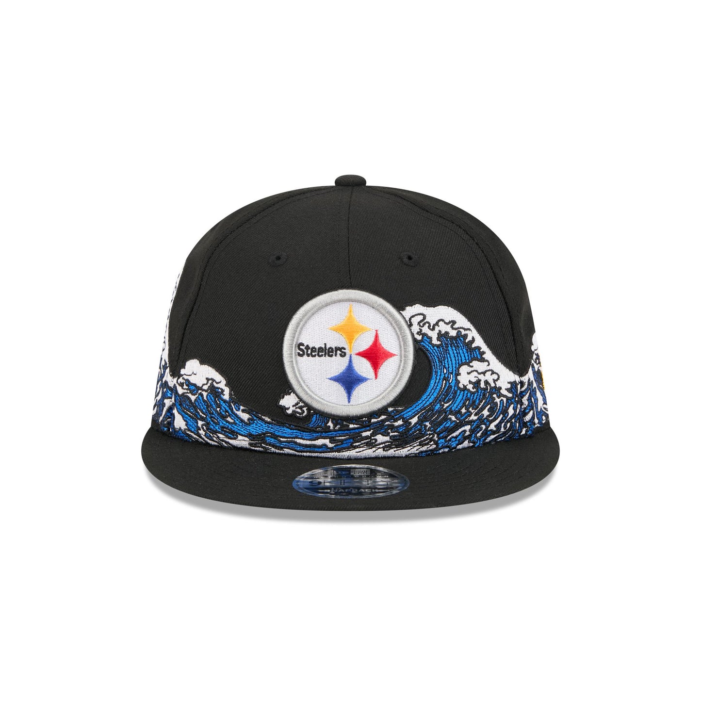 The Pittsburgh Steelers Tidal Flow Retro Crown 9FIFTY Adjustable Cap features an embroidered Steelers logo at the front panels with tidal waves throughout the cap. Additional details include an adjustable snapback closure at the rear and a gray undervisor.