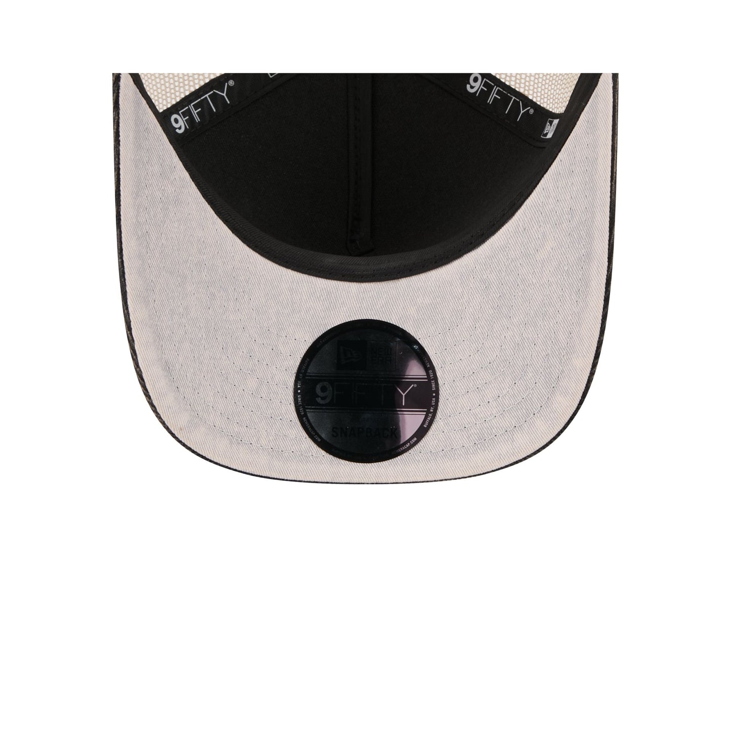 The Pittsburgh Steelers Vintage Landscape 9FIFTY A-Frame Trucker features an embroidered Steelers Vintage Landscape patch at the front panels with a team logo at the right-wear side. Additional details include an adjustable snapback closure at the rear and a gray undervisor.