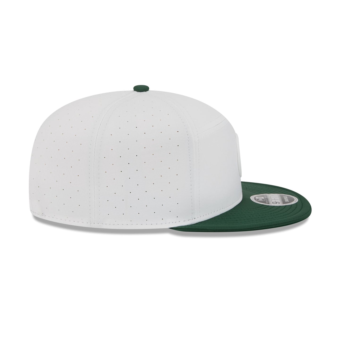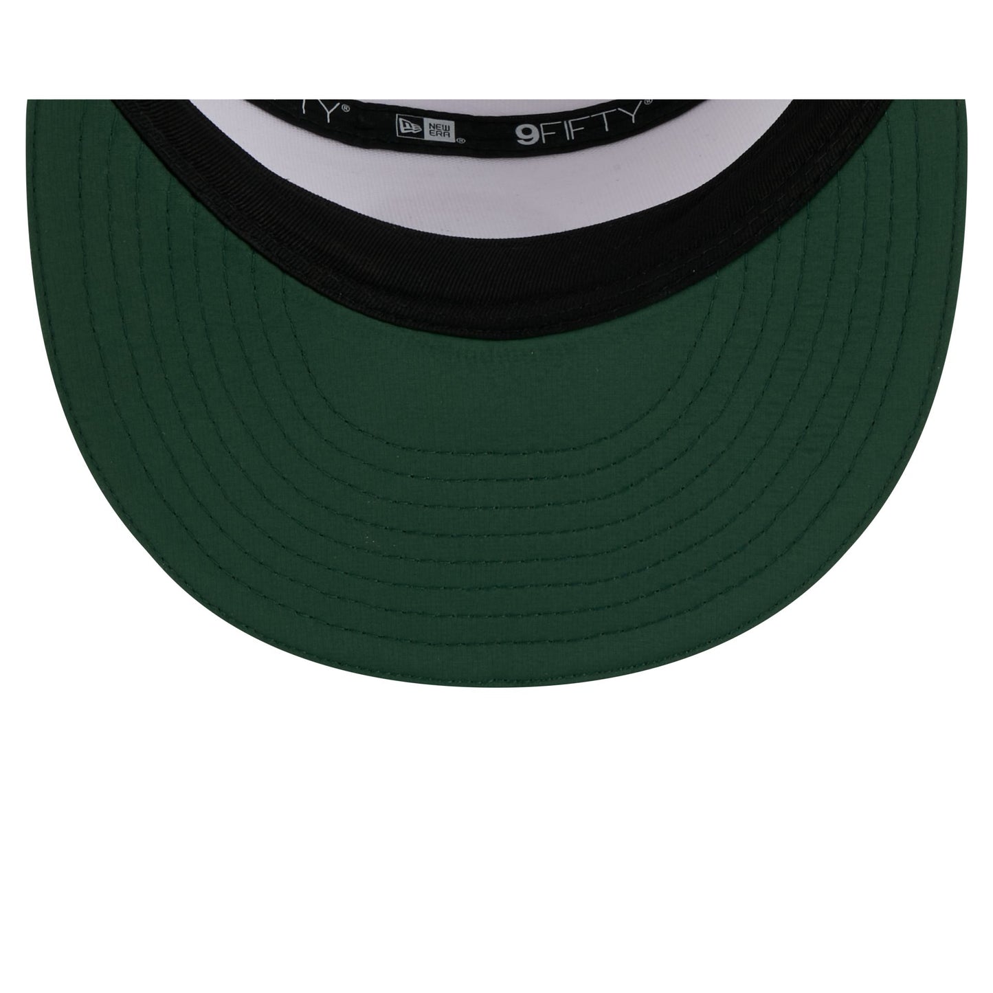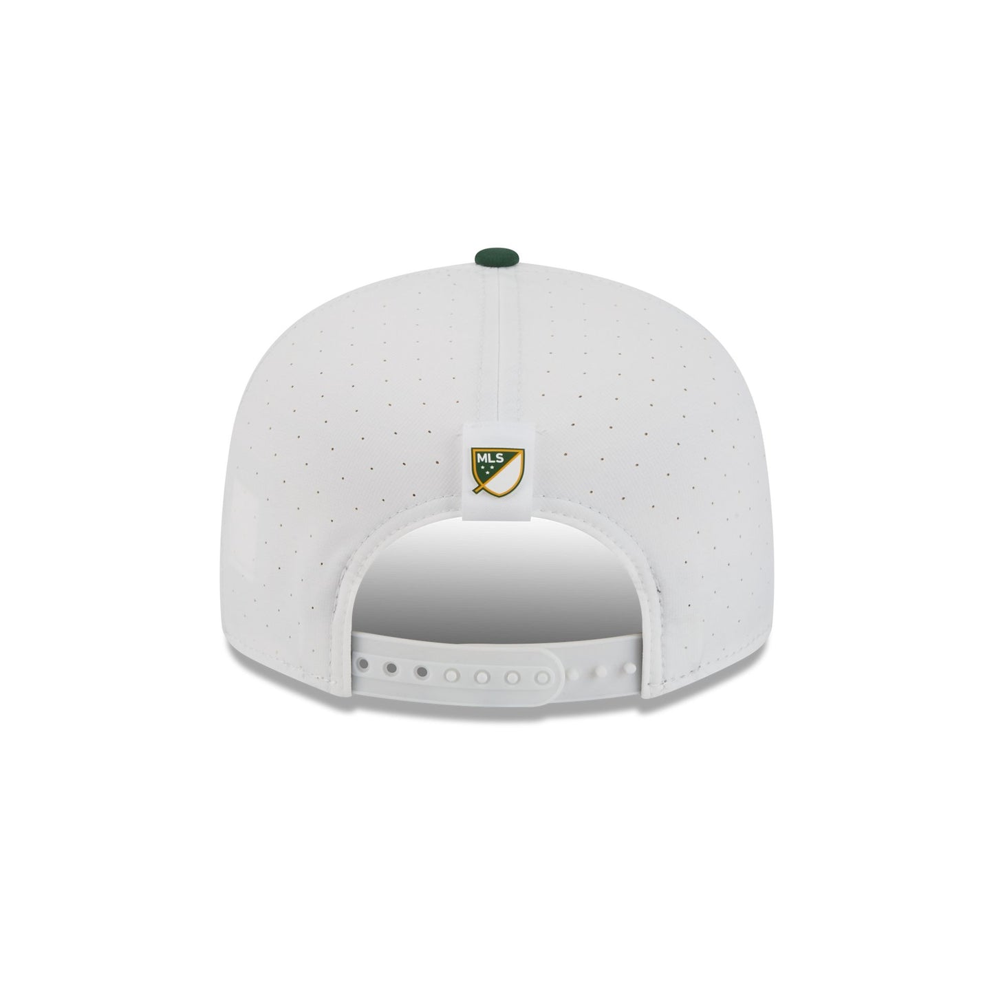 The Portland Timbers 2026 MLS Kickoff Split Panel 9FIFTY Snapback features a stitch-down silicone Timbers logo patch at the front panel with a matching woven MLS Shield tag above a snapback closure at the rear. Additional details include a quill tech performance fabrication with a green visor accented with team color stripes at the front.