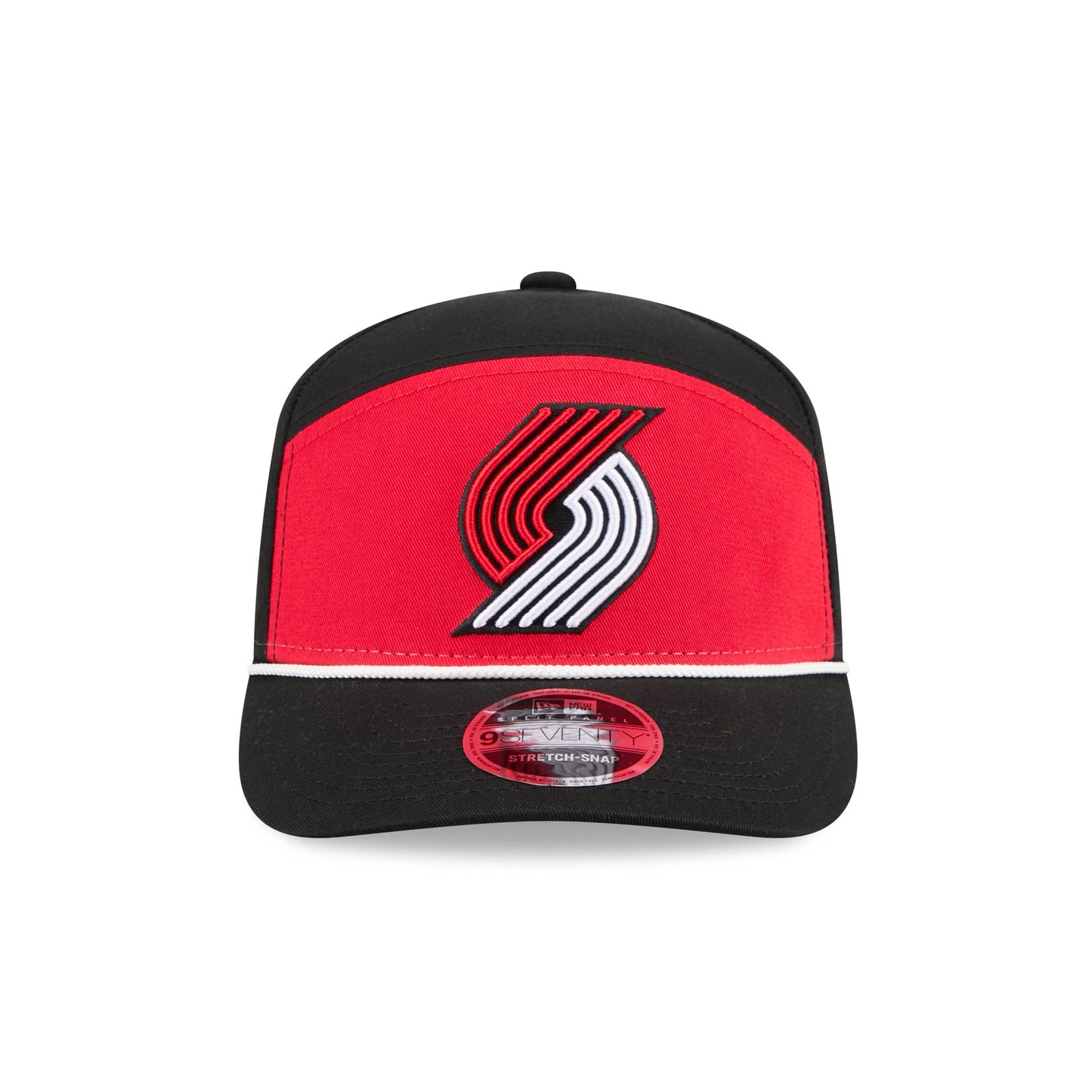 The Portland Trail Blazers Split Panel 9SEVENTY Stretch-Snap features an embroidered Trail Blazers logo at the front panel with a split crown construction and a rope at the visor. Additional details include an adjustable stretch-snap closure at the rear and a gray undervisor.