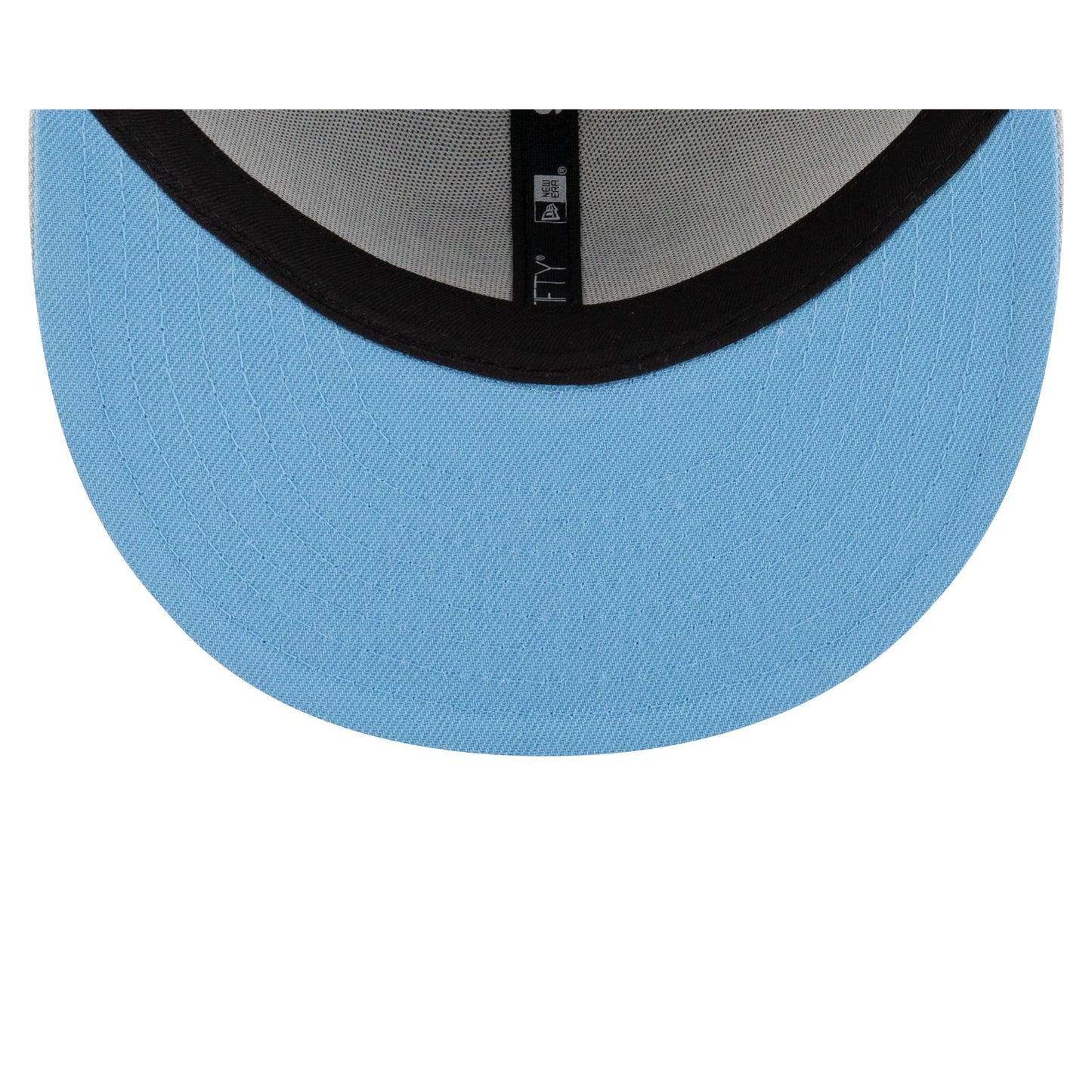 The Powerpuff Girls 25th Anniversary Sky Blue features an embroidered Powerpuff Girls 25th Anniversary logo a the front panels with a Bubbles patch at the right-wear side. Additional details include a blue crown button, a blue undervisor, and a blue snapback closure at the rear.