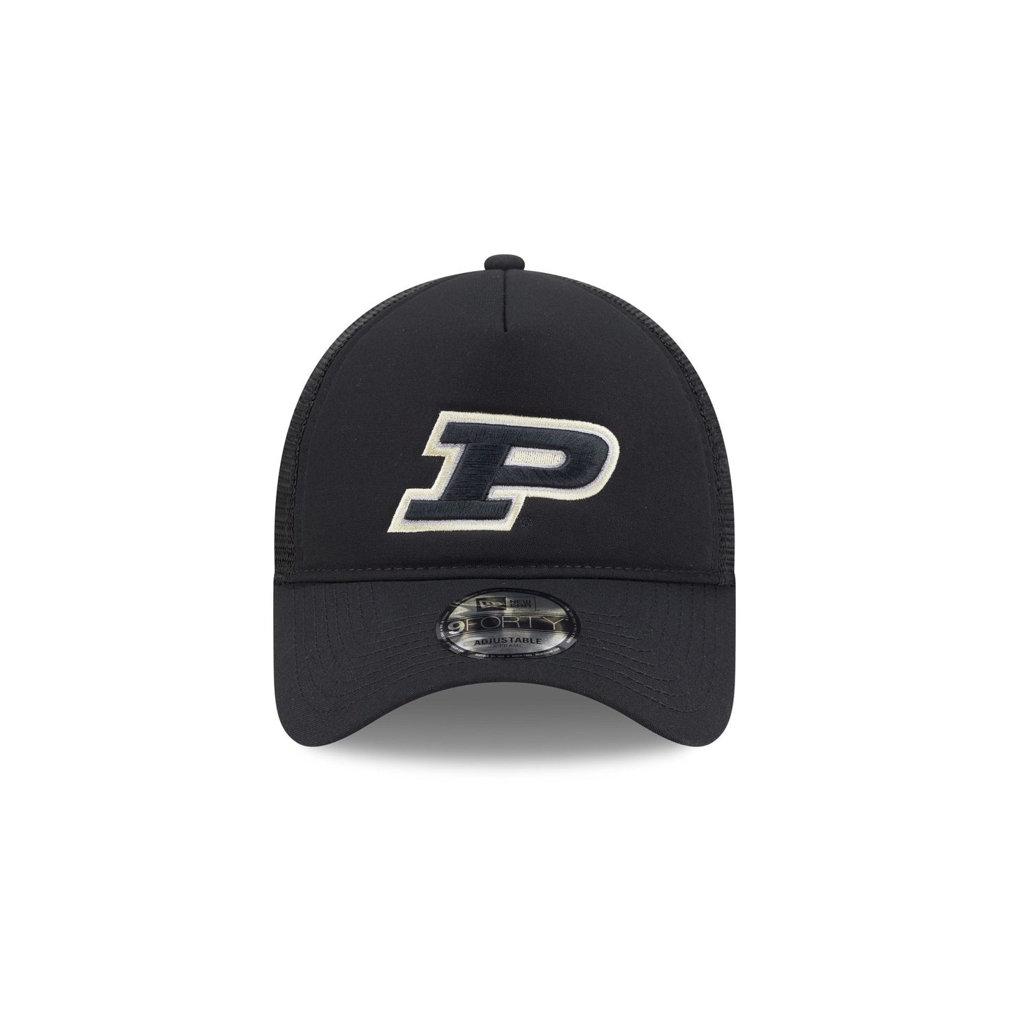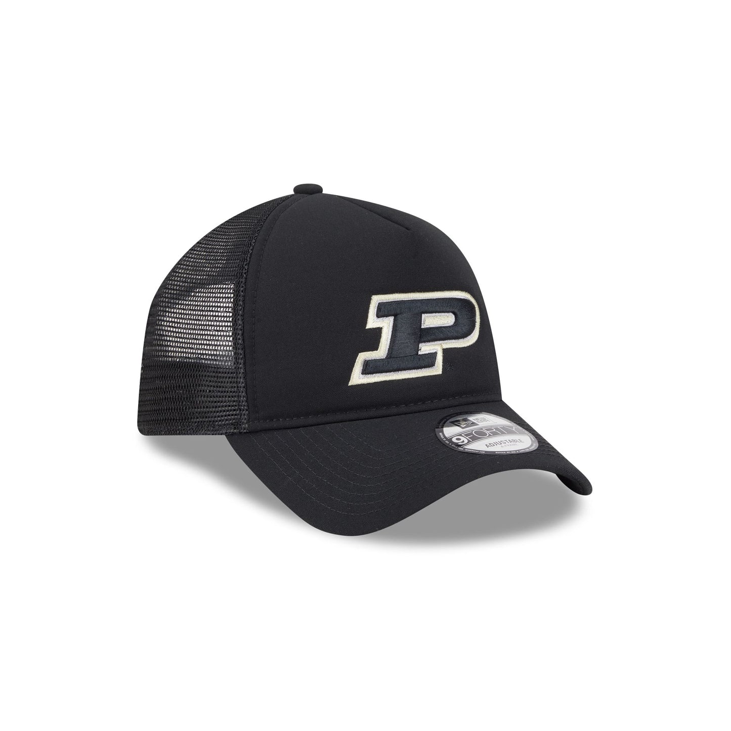 The Purdue Boilermakers Go-To 9FORTY A-Frame Trucker features an embroidered Boilermakers logo at the front panels with a snapback closure at a mesh rear.
