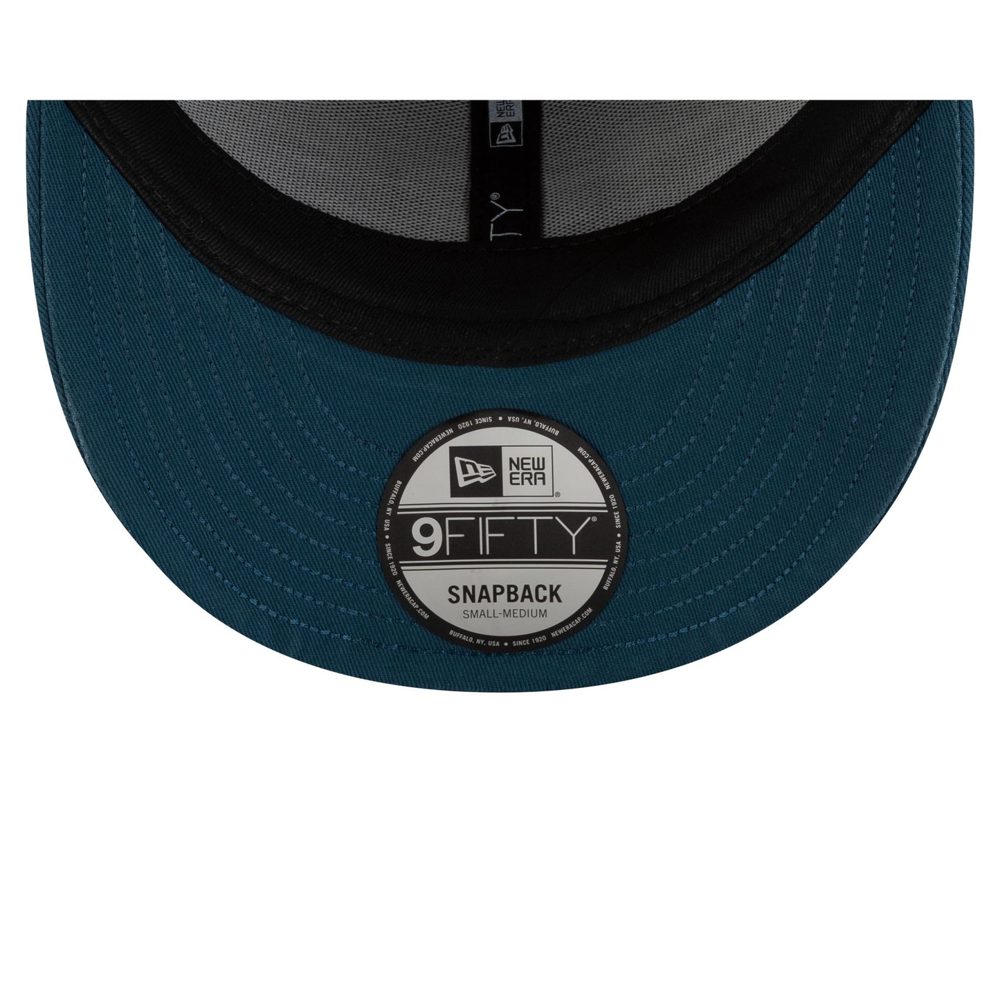 The Quadrant Deep Teal 9FIFTY Snapback features an embroidered Quadrant logo at the front panels with embroidered leaves at a frayed edged visor. Additional details include a distorted HD print Quadrant wordmark at the right-wear side and a QDRNT wordmark above an adjustable snapback closure at the rear.