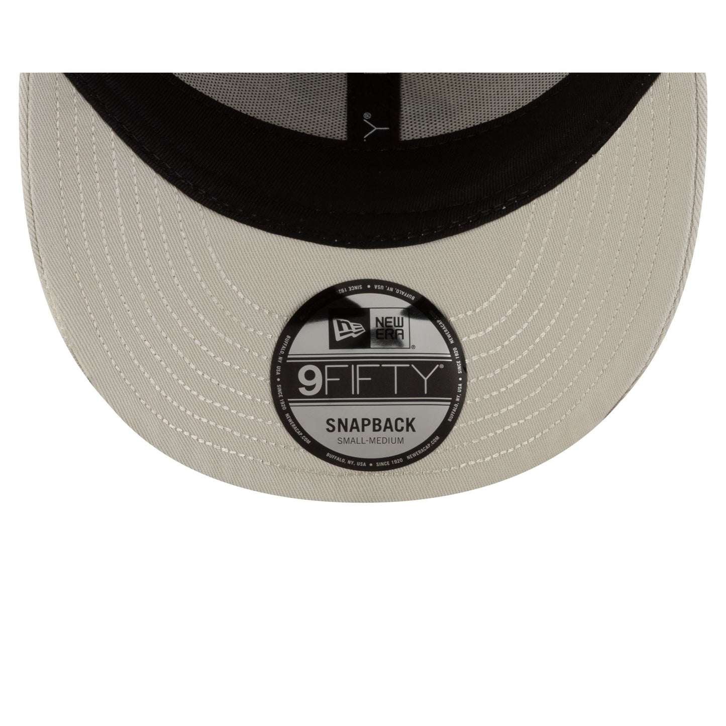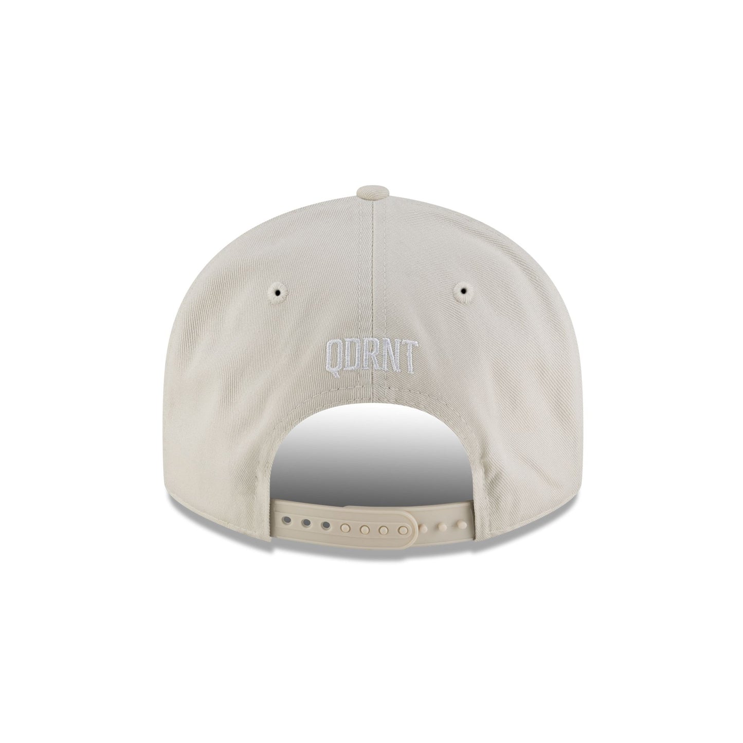 The Quadrant Ivory 9FIFTY Snapback features an embroidered Quadrant logo at the front panels with embroidered leaves at a frayed edged visor. Additional details include a distorted HD print Quadrant wordmark at the right-wear side and a QDRNT wordmark above an adjustable snapback closure at the rear.