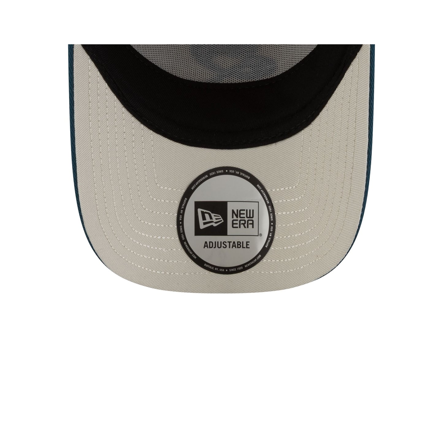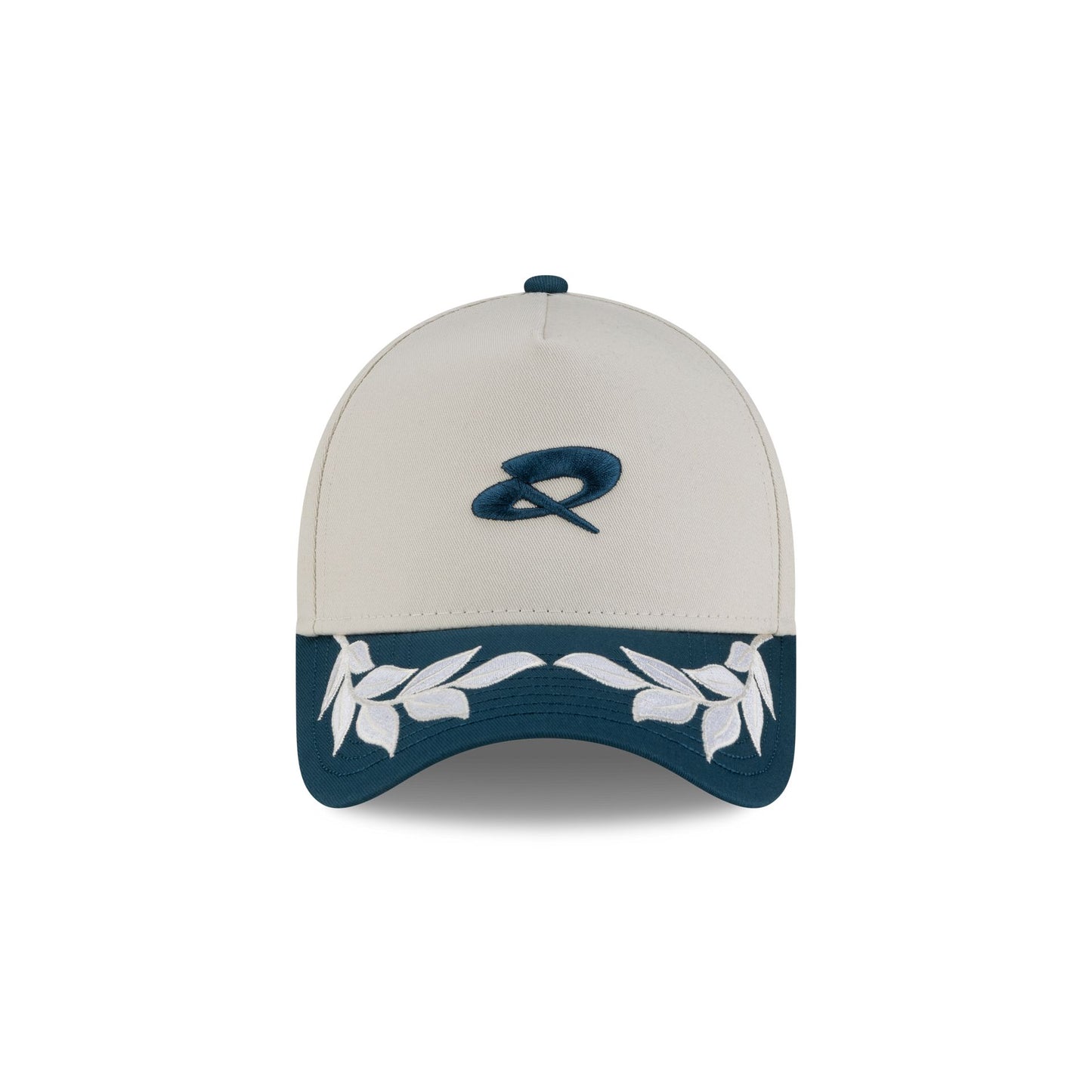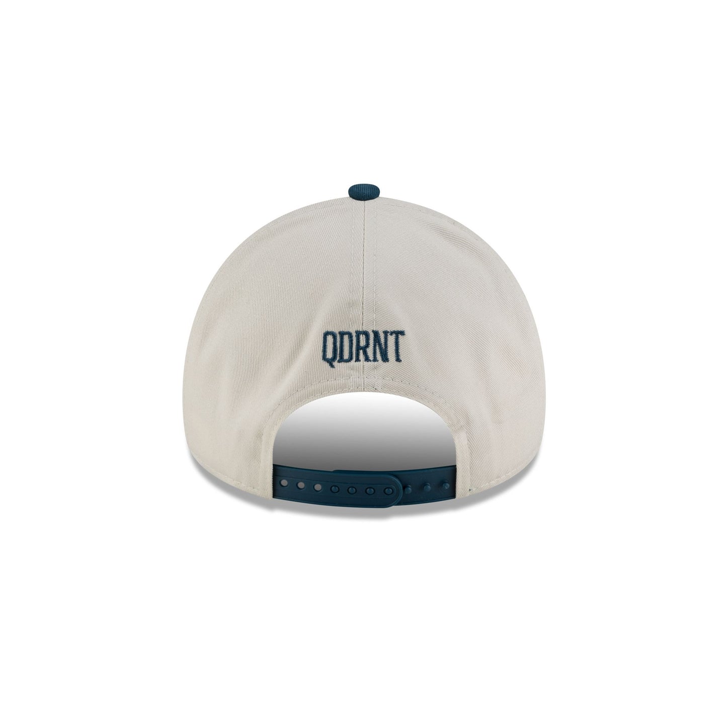 The Quadrant Ivory 9FORTY A-Frame Snapback features an embroidered Quadrant logo at the front panels with embroidered leaves at the visor. Additional details include a distorted HD print Quadrant wordmark at the right-wear side and a QDRNT wordmark above an adjustable snapback closure at the rear.