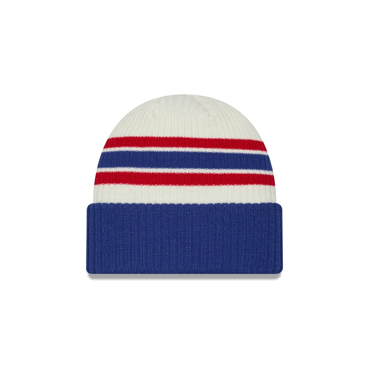 The Quebec Nordiques Vintage Ribbed Beanie features an embroidered Nordiques logo at the front cuff and stripes at the crown.