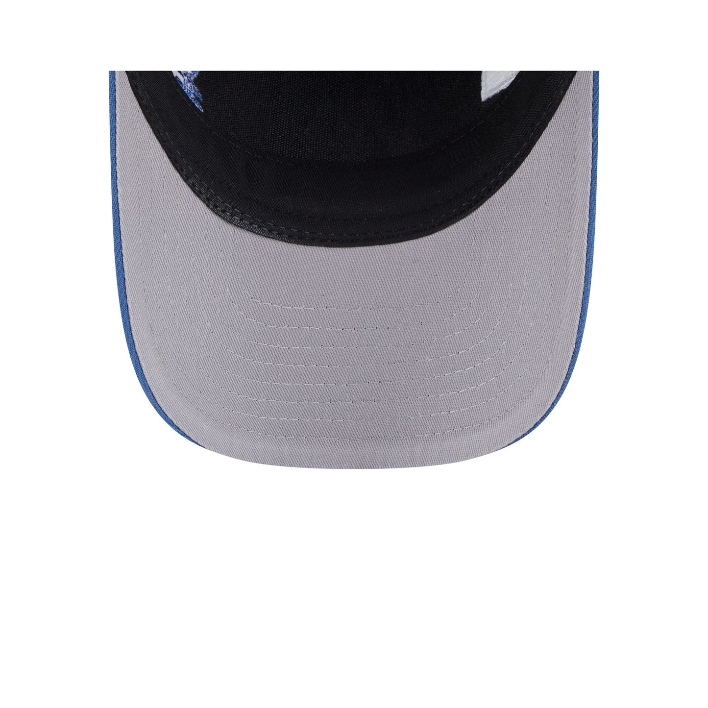 The Rayados Indigo 9FORTY M-Crown A-Frame Trucker features the Rayados primary logo embroidered at the front panel with alternate team logos throughout the crown, a team wordmark above a snapback closure at the rear, and a gray undervisor.