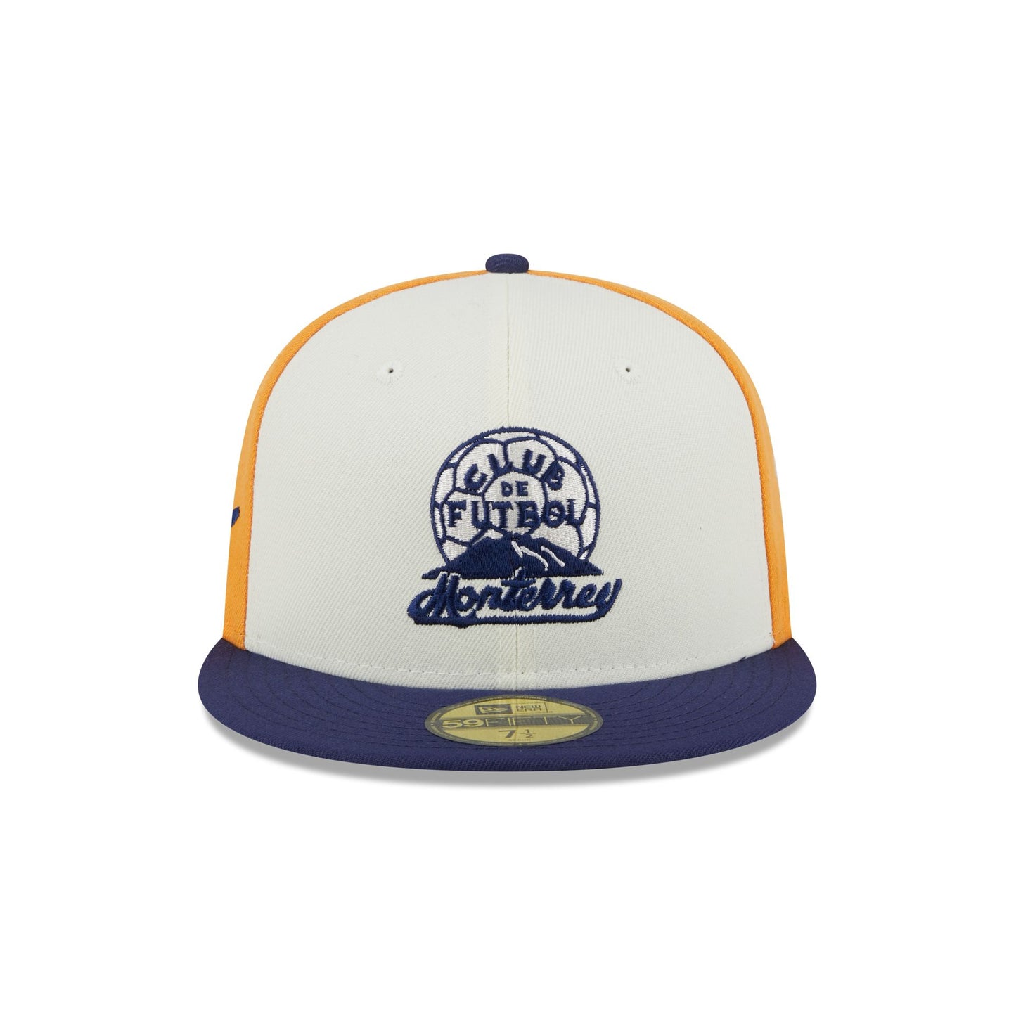 The Rayados Retro Logo 59FIFTY Fitted Cap features an embroidered Rayados retro navy logo at the front panels with the current team logo at the rear. Additional details include the team's established date at the right-wear side, a navy undervisor, and a duel colored crown.