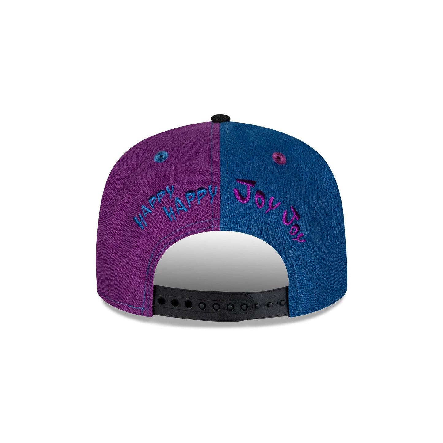 The Ren & Stimpy 9FIFTY Snapback Hat features an embroidered Ren & Stimpy character patch against a purple and blue split panel. Additional details include a Twerking Since '91 patch at the right-wear side and a "Happy Happy Joy Joy" embroidery above a snapback closure at the rear.