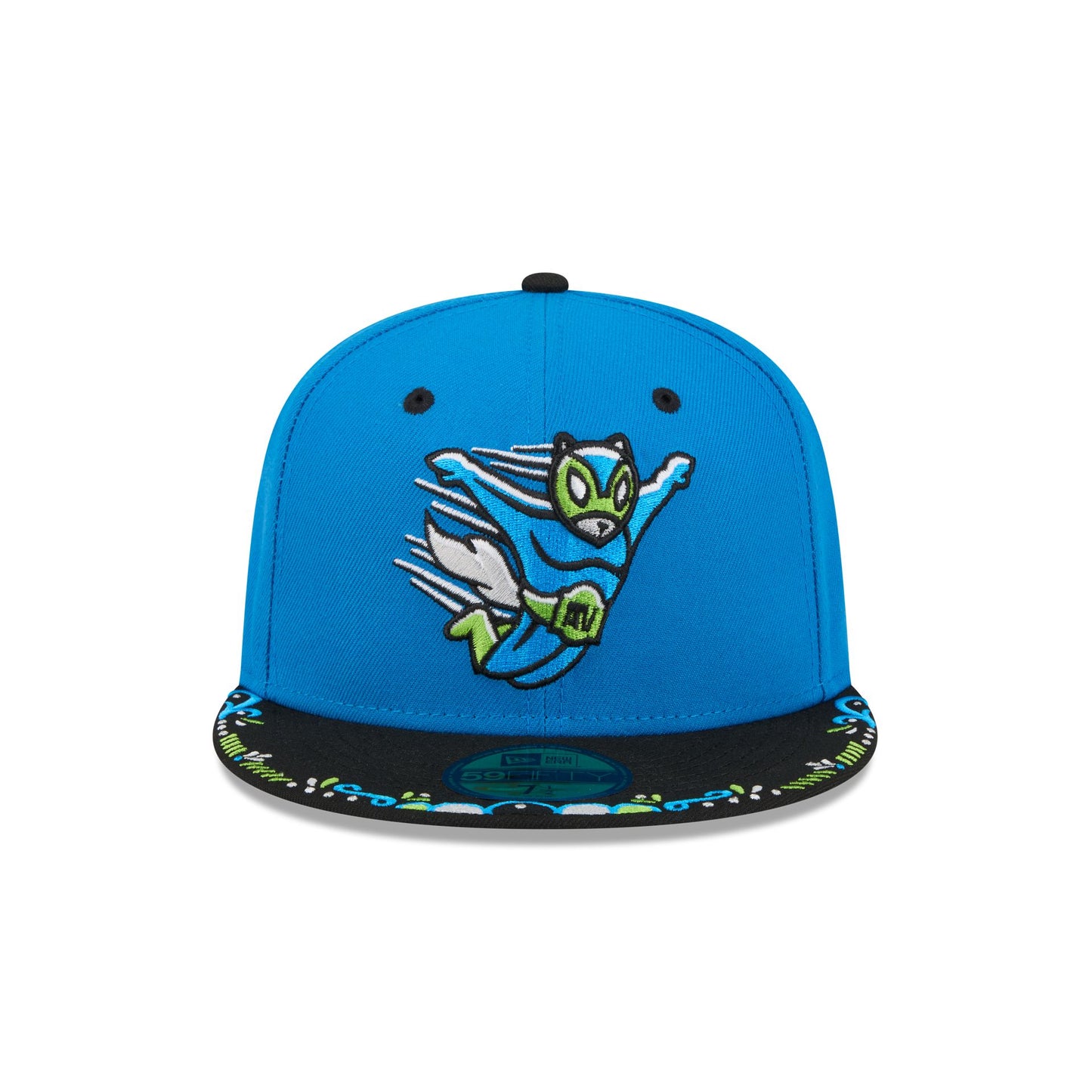 The Richmond Flying Squirrels 2026 Copa de la Diversión 59FIFTY Fitted Cap features an embroidered Flying Squirrels logo at the front panels with a matching MiLB Batterman logo at the rear, a decorative embroidery at the visor, and a gray undervisor.