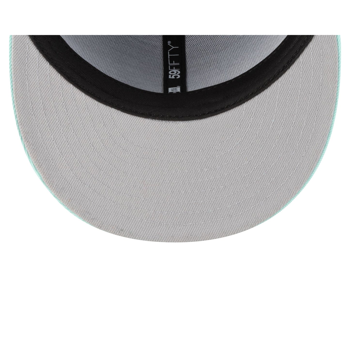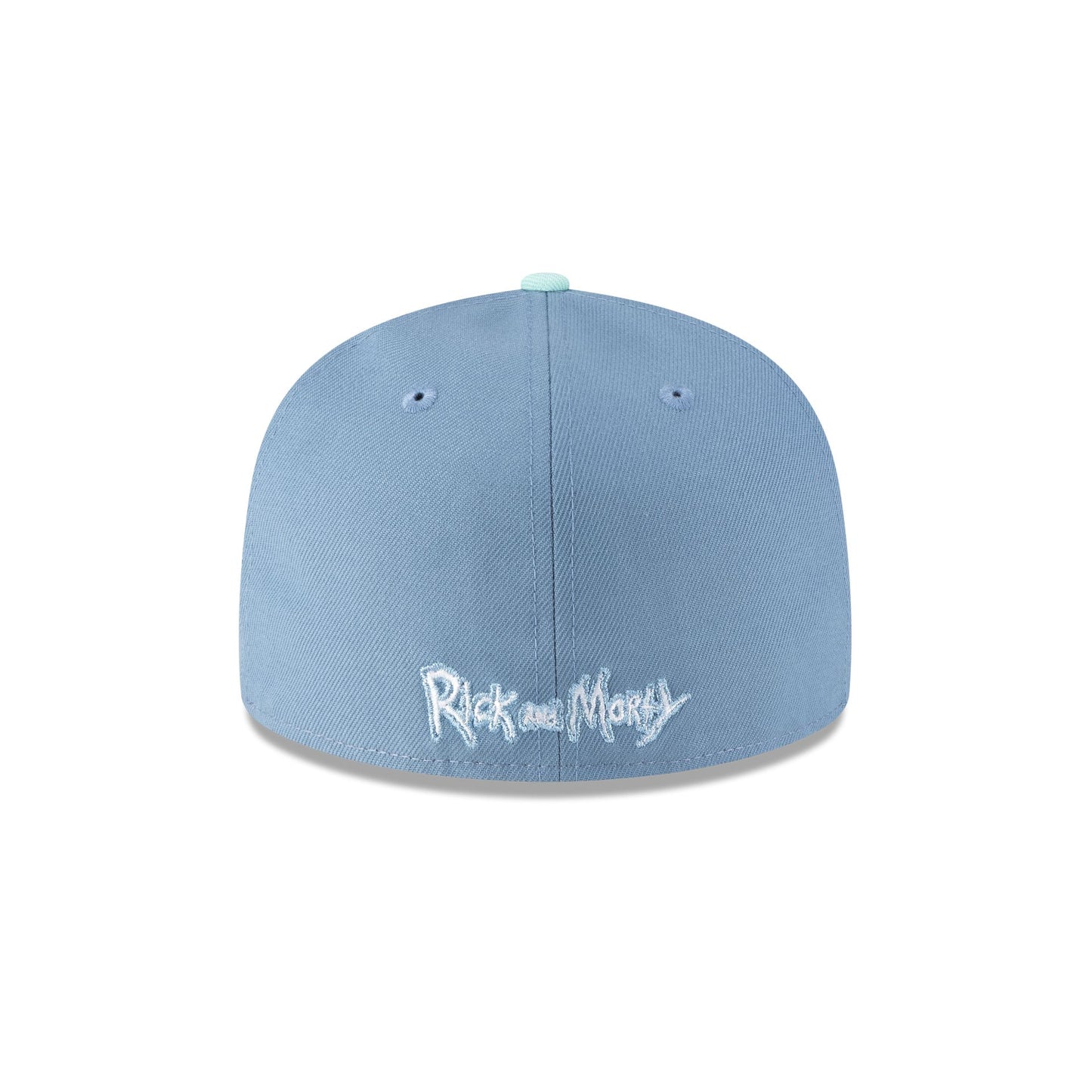 The Rick And Morty Rickmas Rick Snow Angel 59FIFTY Fitted Cap features an embroidered Rick snow angel graphic at the front panels with a Rick and Morty logo at the rear and a gray undervisor.