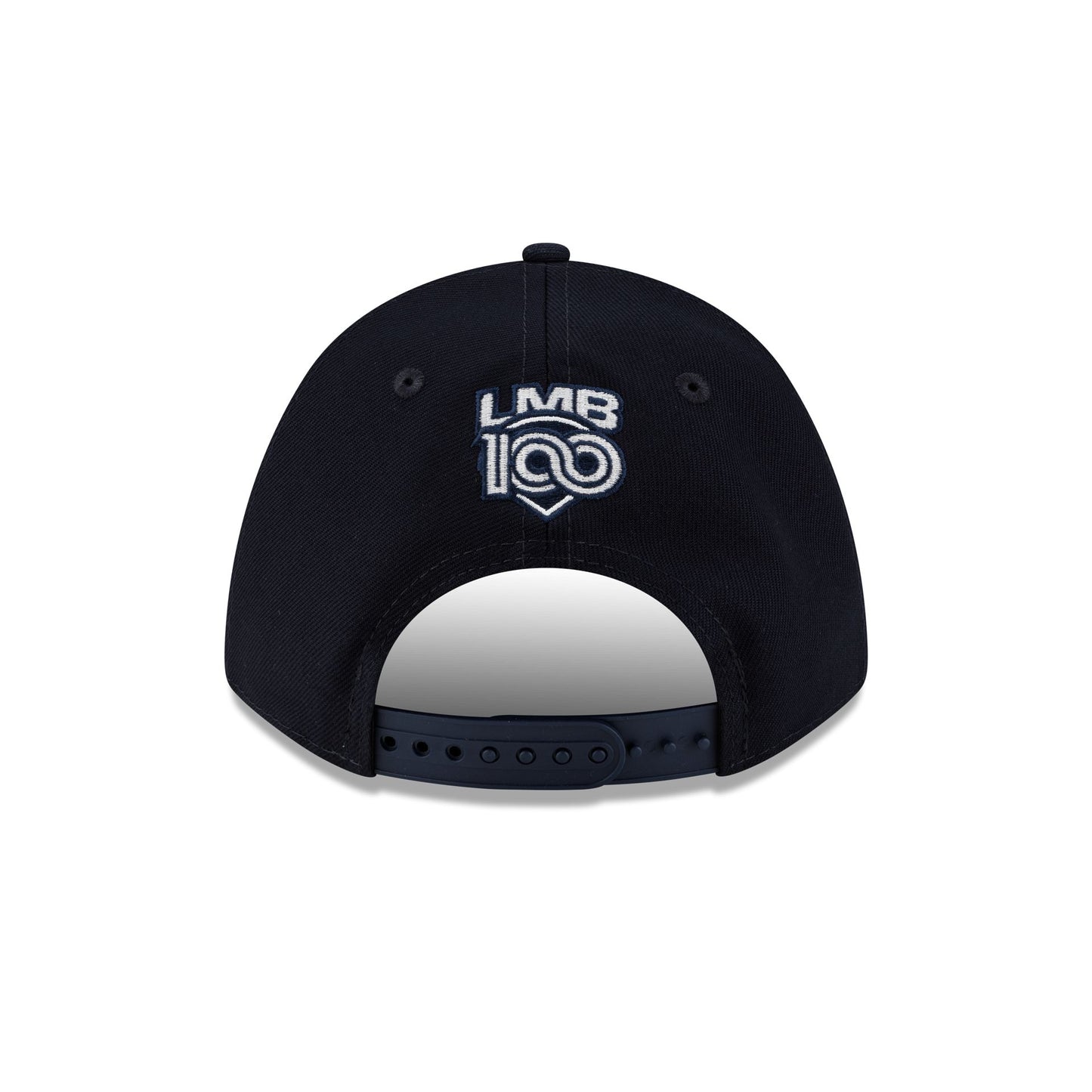 The Rieleros de Aguascalientes Retro 9FORTY M-Crown Snapback features an embroidered Reileros retro logo at the front panels with a 100th Anniversary LMB logo above an adjustable snapback closure at the rear.