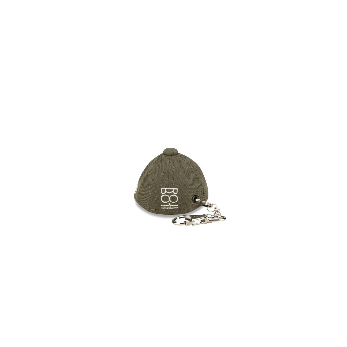 The Rodrigo Roji x New Era Cap Keychain Mini 59FIFTY Fitted Cap features an embroidered Rodrigo Roji white flower patch at the front panels with a Roji logo at the rear and a lobster claw clasp.