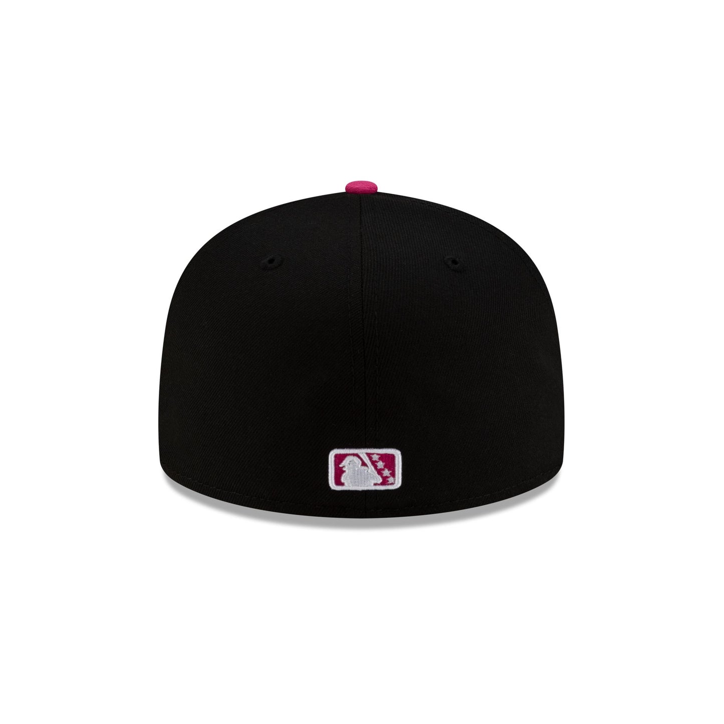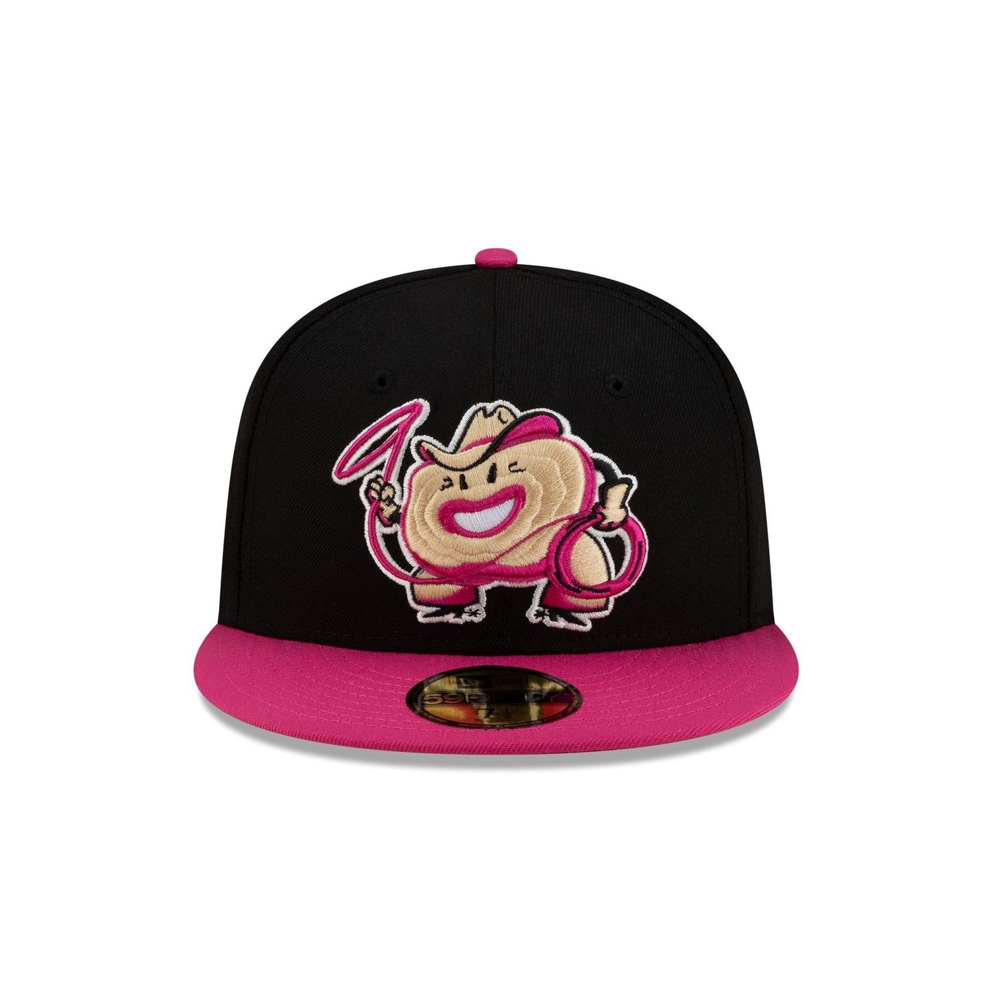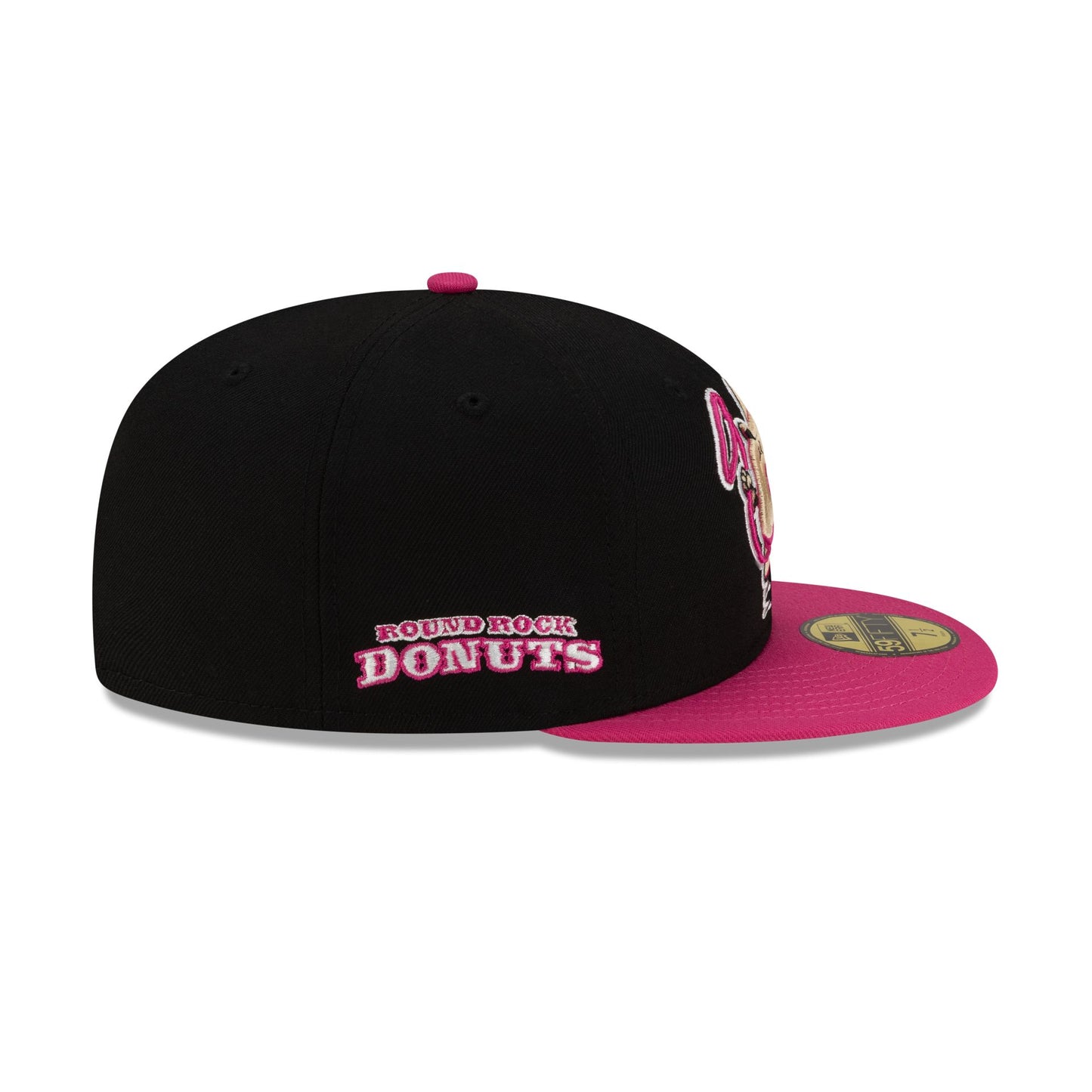 The Round Rock Express Black Food Pack 59FIFTY Fitted Cap features an embroidered Express donut themed logo at the front panels with a matching MiLB Batterman logo at the rear, a Donuts team wordmark at the right-wear side, and a pink undervisor.
