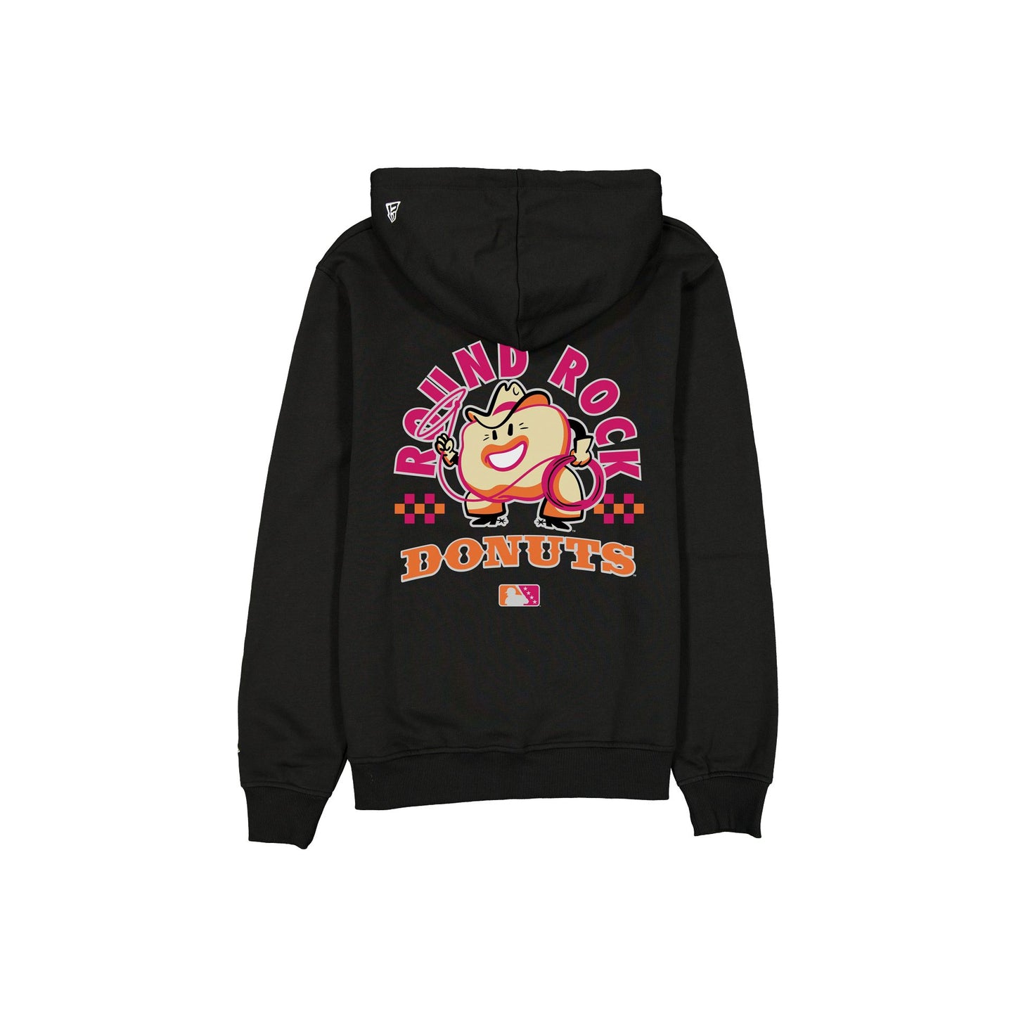 The Round Rock Express Black Food Pack Hoodie features a screen-printed Express Donuts themed logo at the left chest with a matching graphic at the rear.
