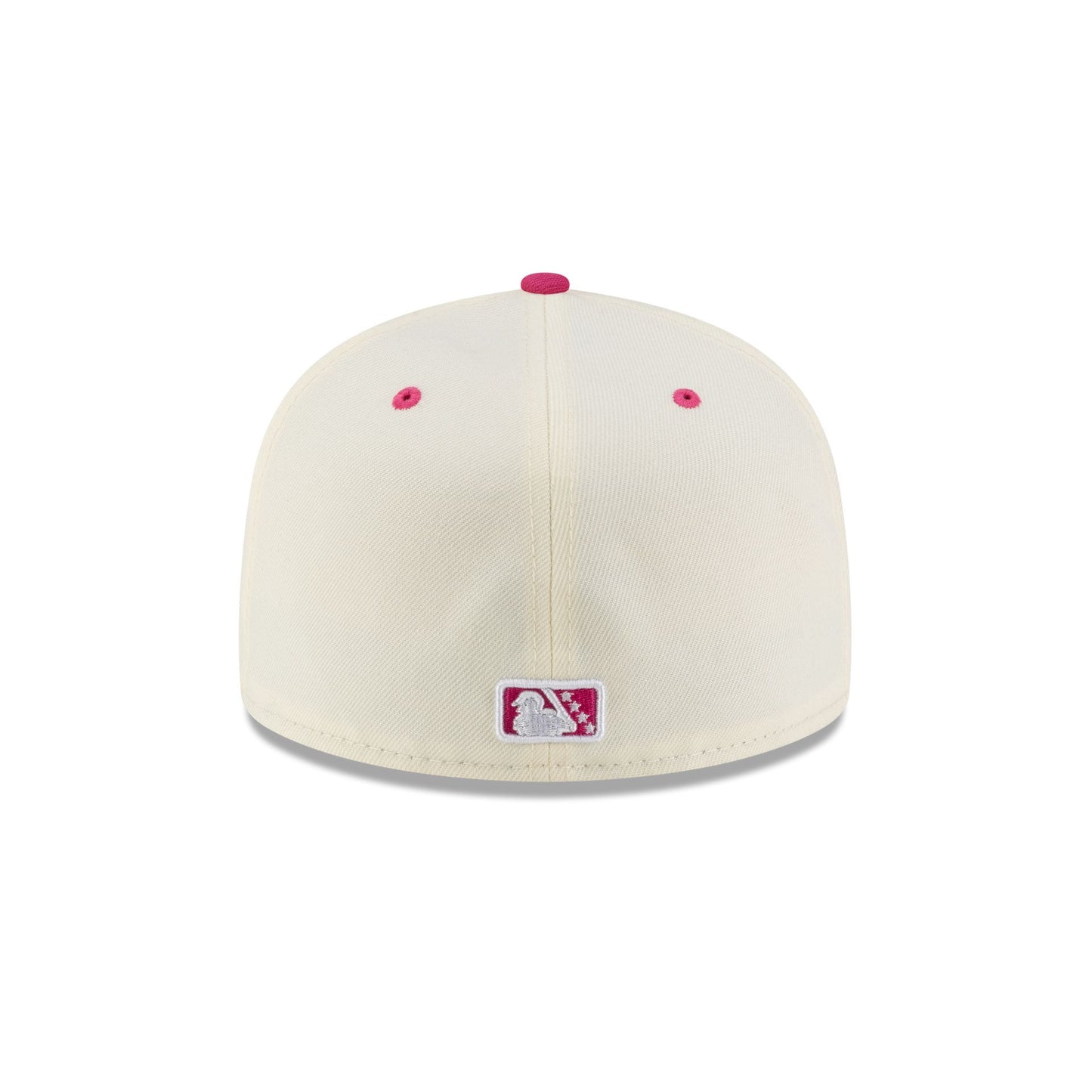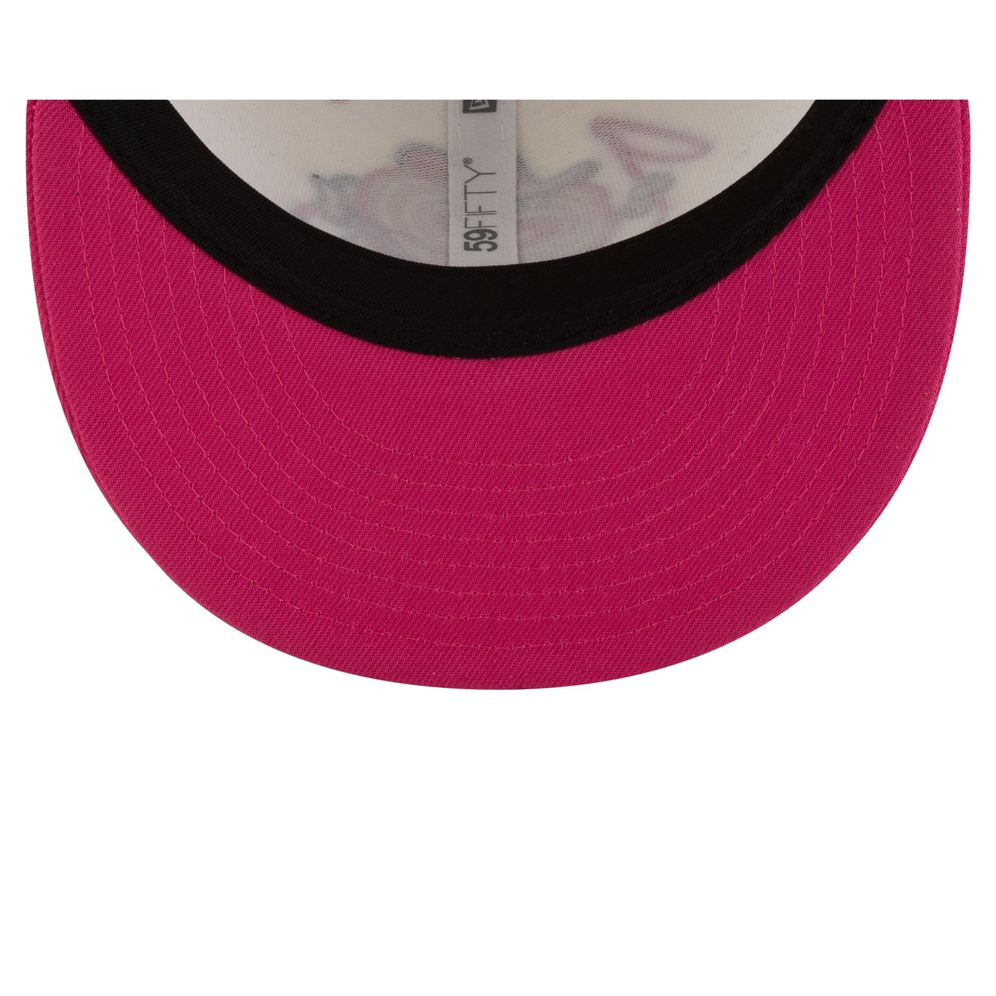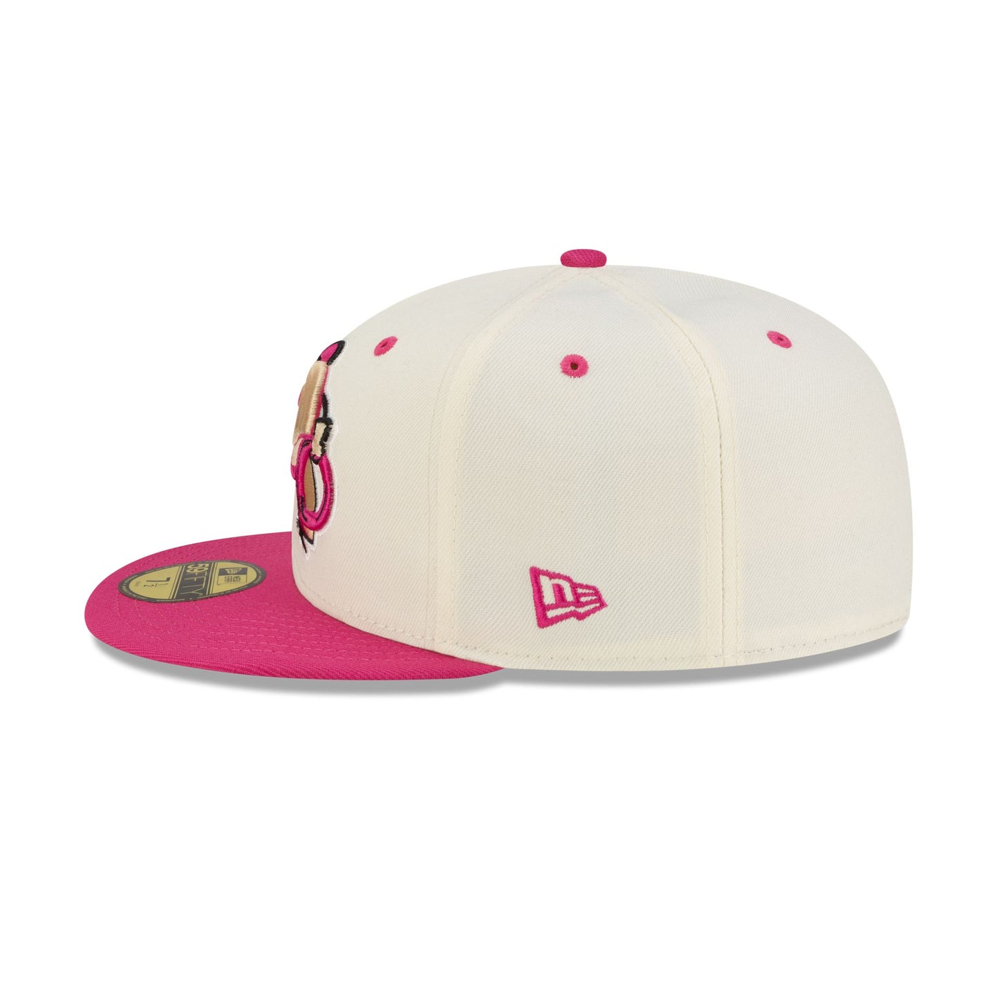 The Round Rock Express Chrome Food Pack 59FIFTY Fitted Cap features an embroidered Express donut themed logo at the front panels with a matching MiLB Batterman logo at the rear, a Donuts team wordmark at the right-wear side, and a pink undervisor.