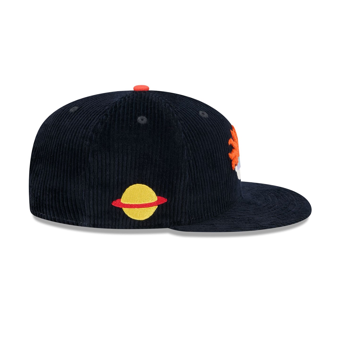 The Rugrats Chuckie Corduroy 9FIFTY Snapback features a Chuckie embroidery at the front panels with reflective glasses. Additional details include an adjustable snapback closure at the rear and an orange undervisor.