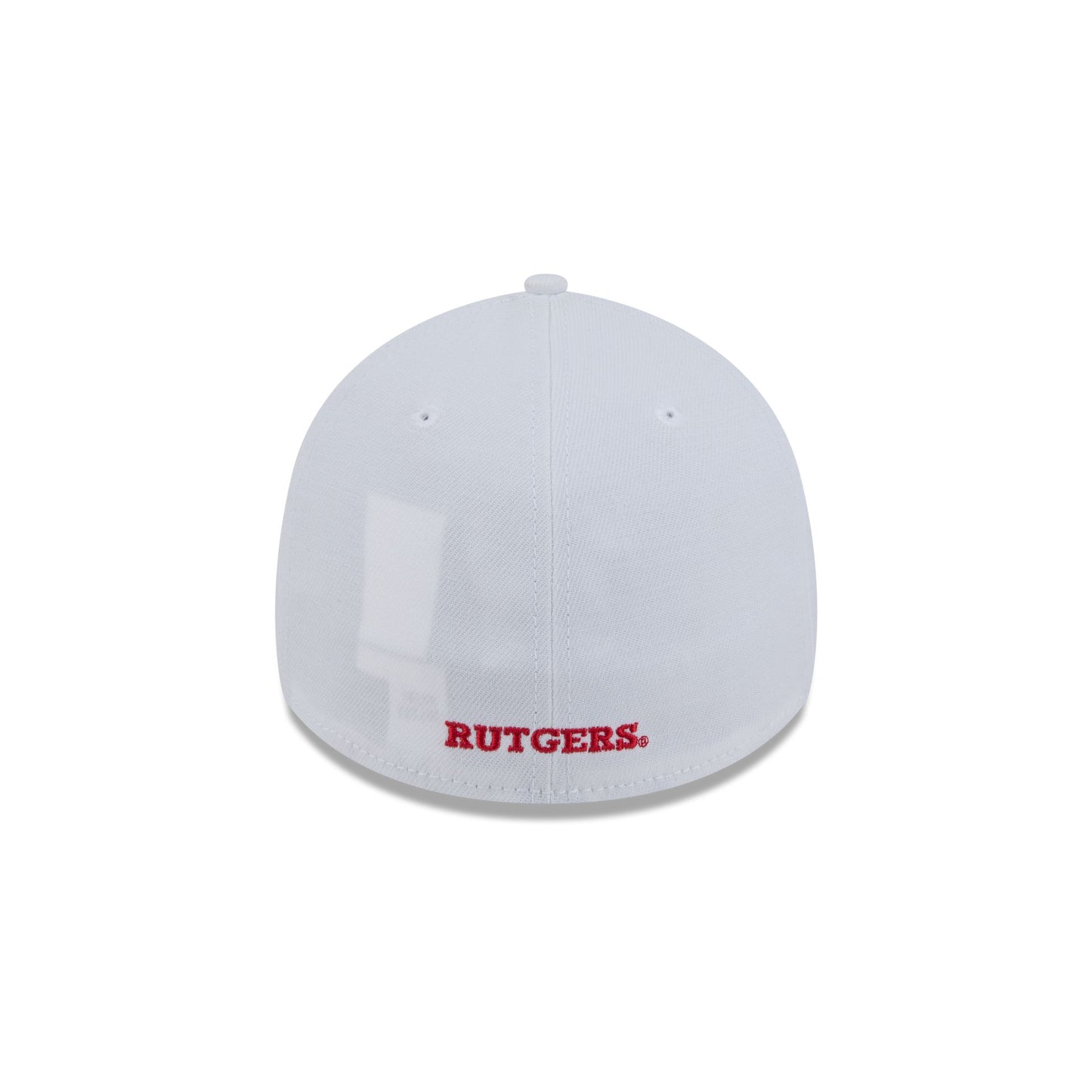 The Rutgers Scarlet Knights Optic White 39THIRTY Stretch Fit features an embroidered Knights logo at the front panels with a team wordmark at the rear.