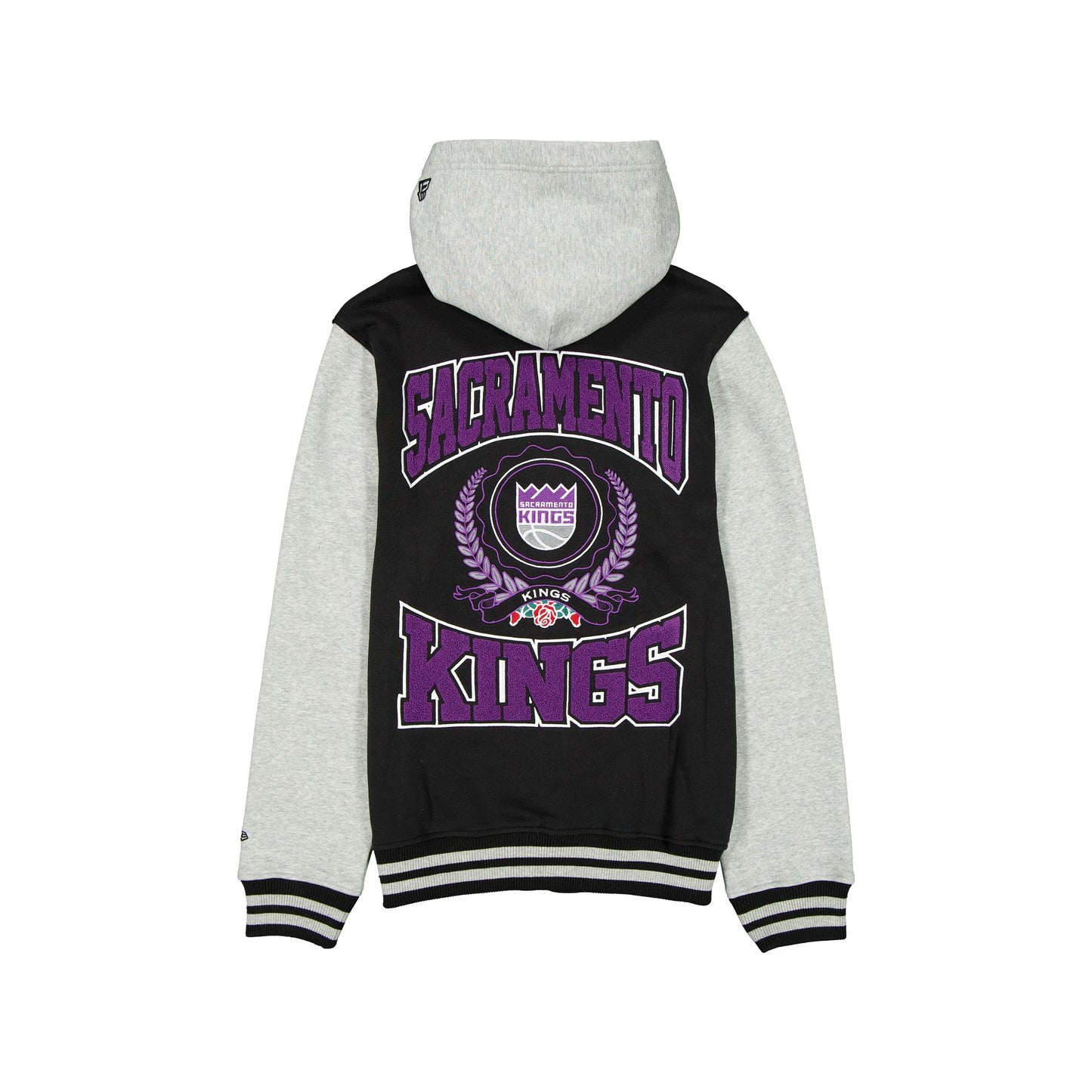 The Sacramento Kings Throwback Prep Jacket features a chain-stitched Kings script at the right chest with a chenille applique team logo at the left chest. Additional details include a snap front closure with a chenille applique wordmark and team emblem at the rear.