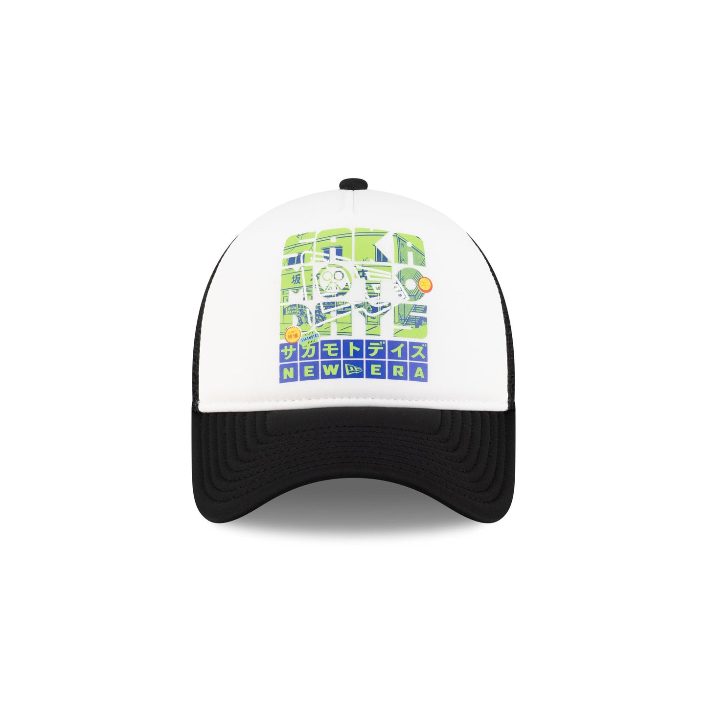 The Sakamoto Days 9FORTY A-Frame Trucker features an embroidered Sakamoto Days graphic at the front panels with an adjustable snapback closure at a mesh rear.