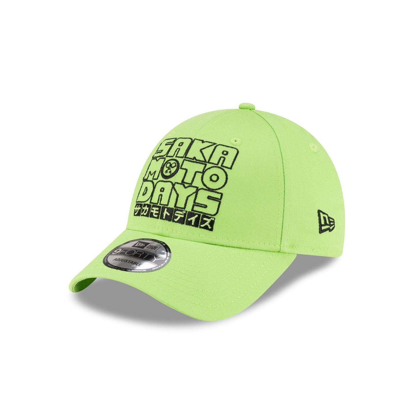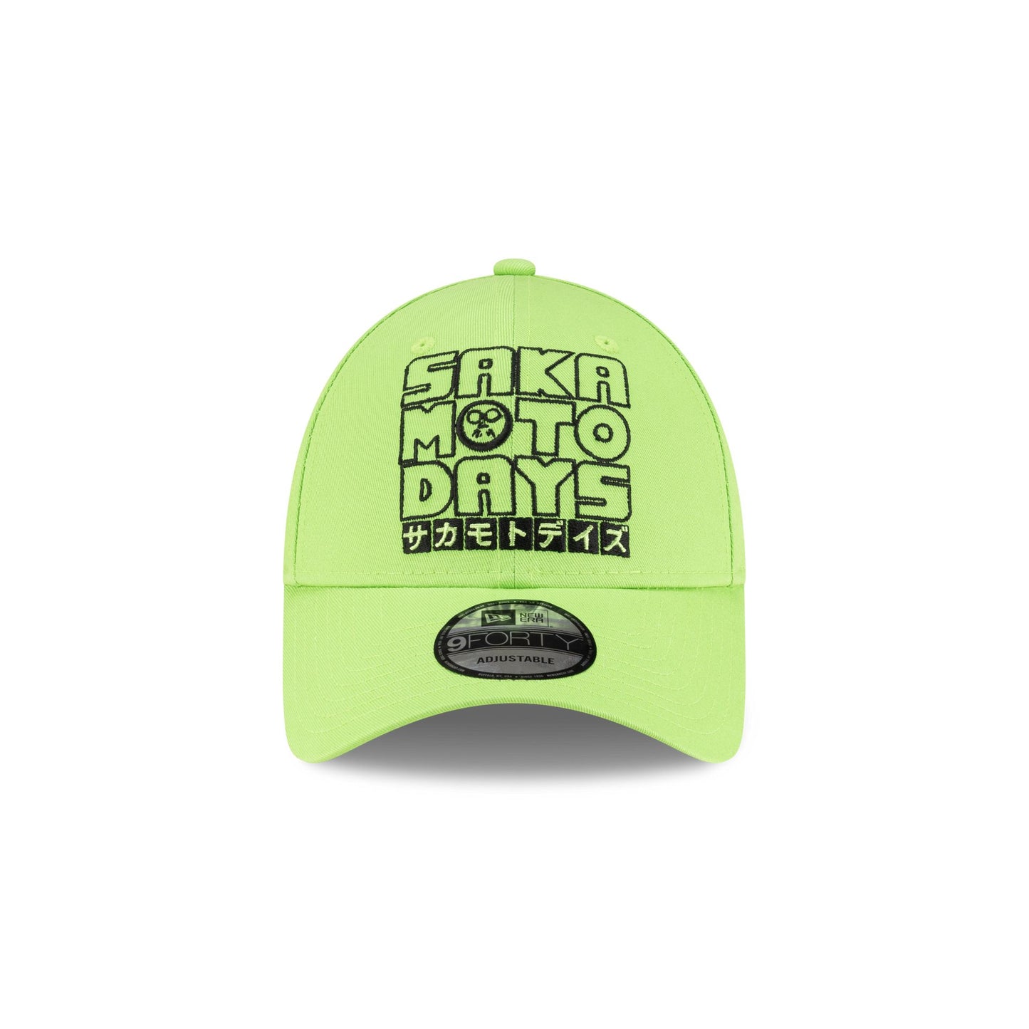 The Sakamoto Days Green 9FORTY Adjustable Cap features an embroidered Sakamoto Days wordmark at the front panels with a patch at the right-wear side and an adjustable D-Ring closure at the rear.