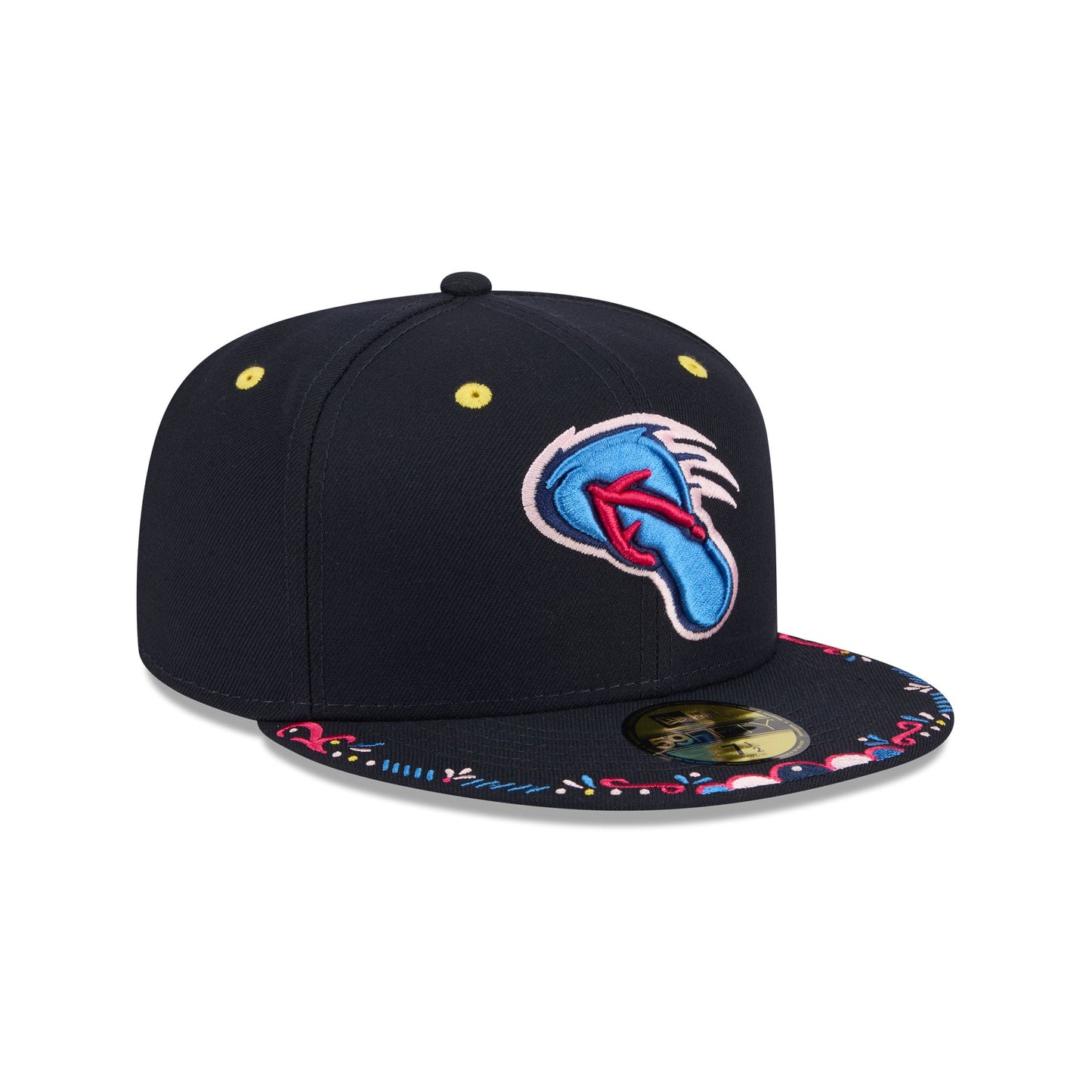 The San Antonio Missions 2026 Copa de la Diversión 59FIFTY Fitted Cap features an embroidered Missions logo at the front panels with a matching MiLB Batterman logo at the rear, a decorative embroidery at the visor, and a gray undervisor.