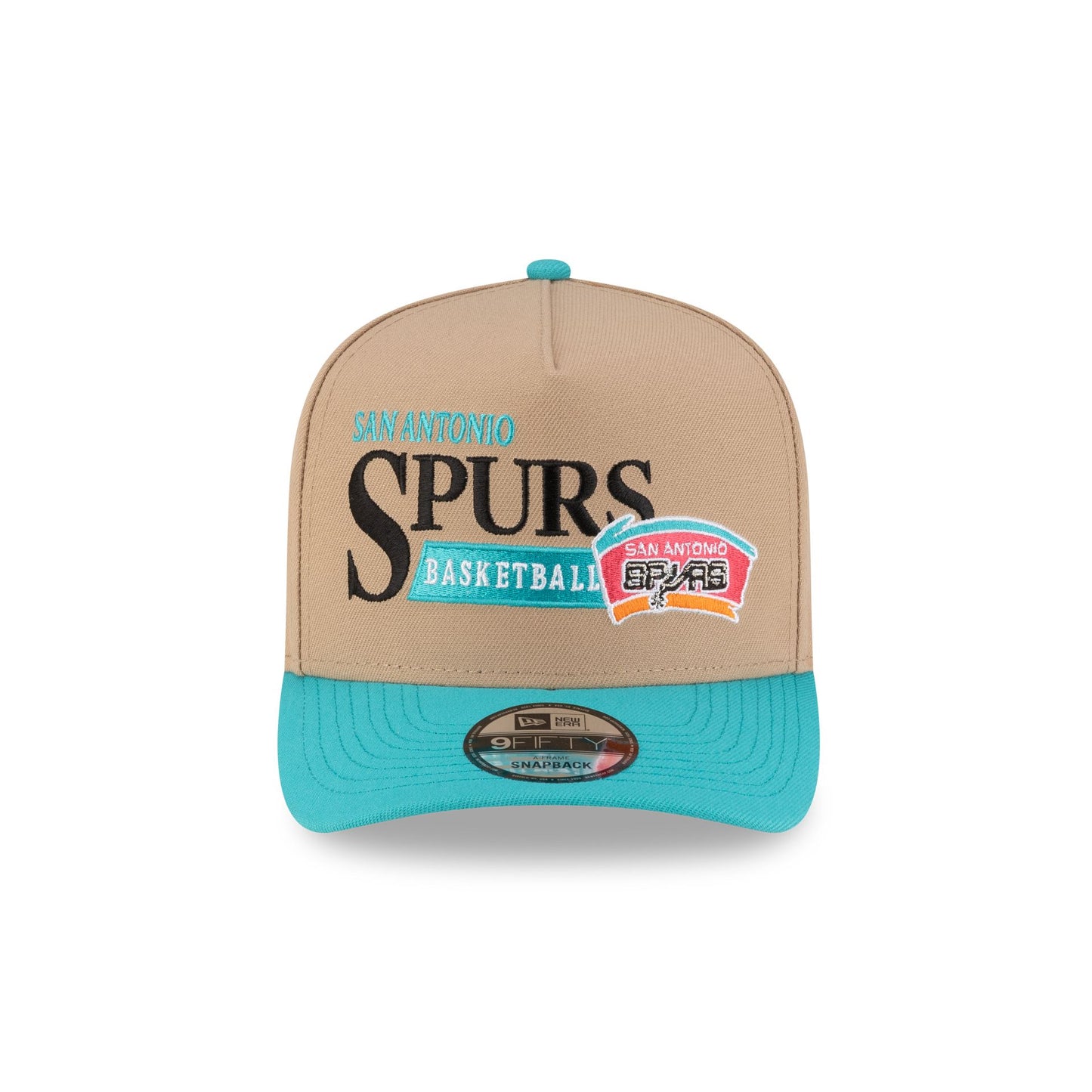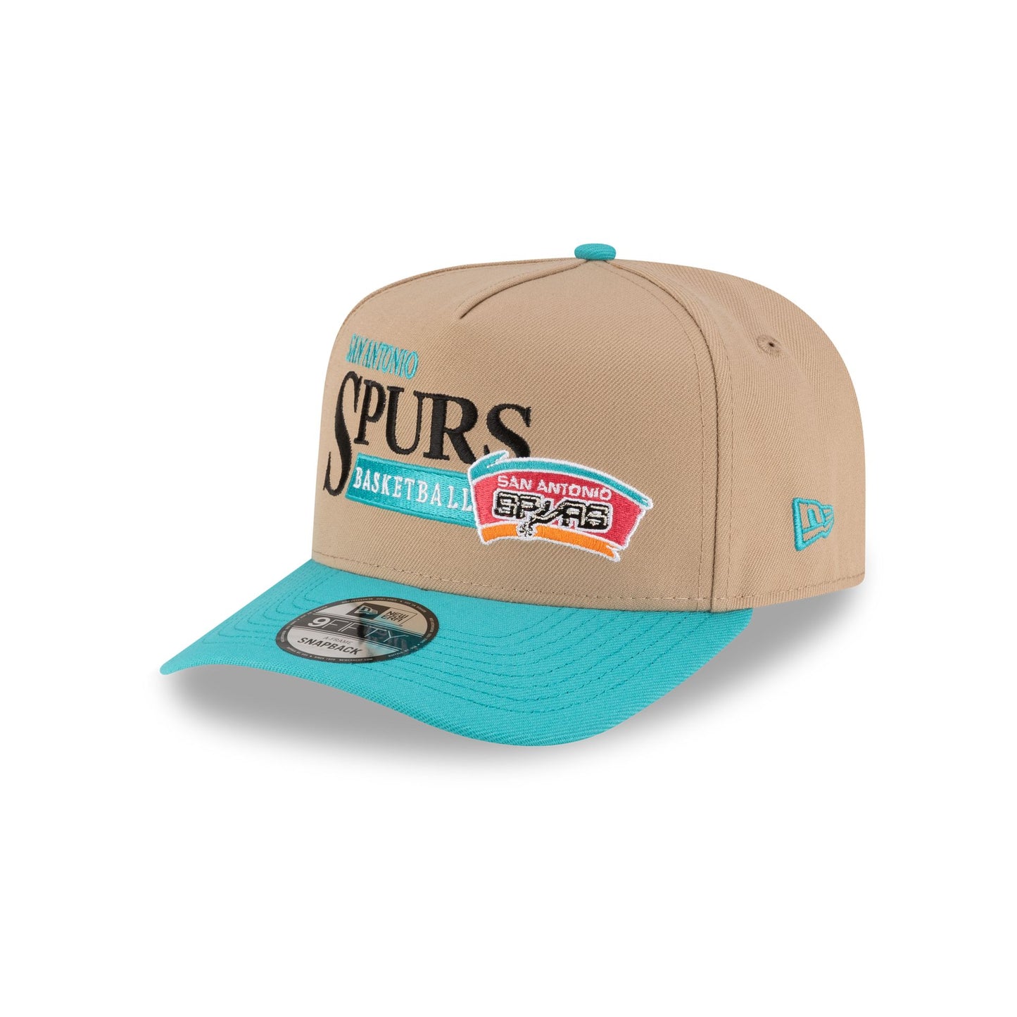 The San Antonio Spurs 1989-2002 Hardwood Classics Liner Camel 9FIFTY A-Frame Snapback Cap features an embroidered Spurs 1989-2002 Hardwood Classics graphic at the front panels with a team patch at the right-wear side. Additional details include an adjustable snapback closure at the rear and a gray undervisor.
