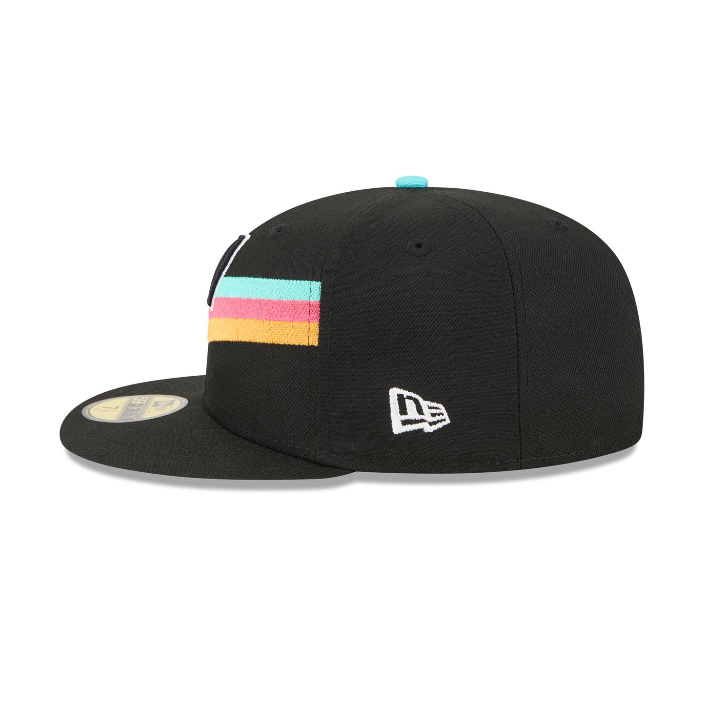 The San Antonio Spurs 2025 City Edition 59FIFTY Fitted Cap features an embroidered Spurs City Edition logo at the front panels with a logo at the right-wear side. Additional details include the NBA Logoman at the rear and a gray undervisor.