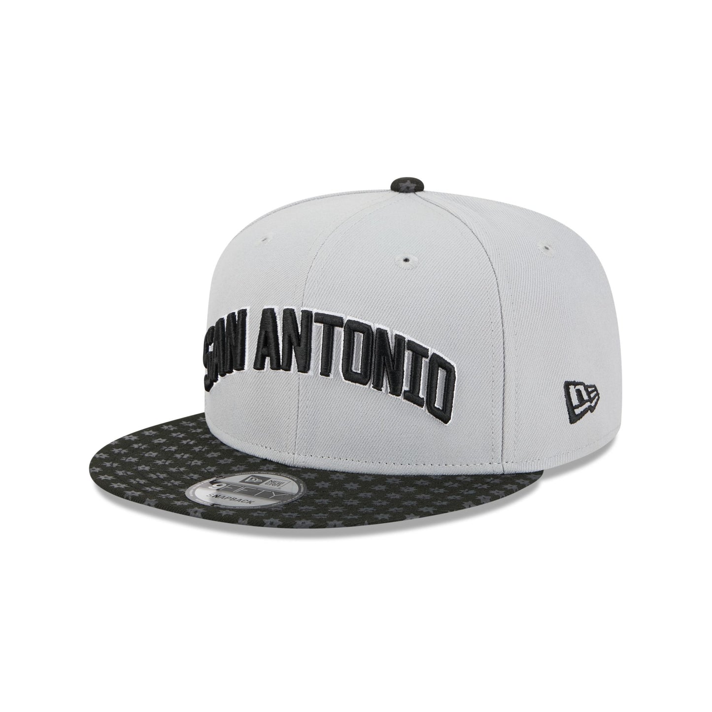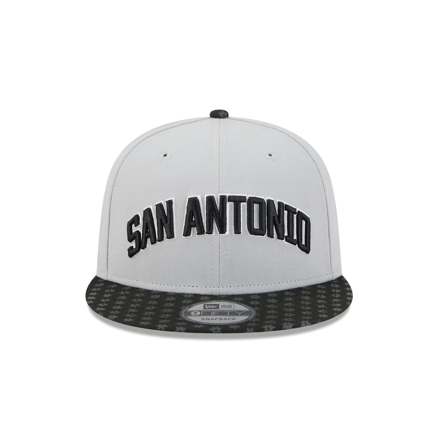 The San Antonio Spurs 2025 Statement Edition 9FIFTY Snapback features an embroidered Spurs Statement Edition logo at the front panels with a logo at the right-wear side. Additional details include the NBA Logoman above an adjustable snapback closure at the rear and a gray undervisor.