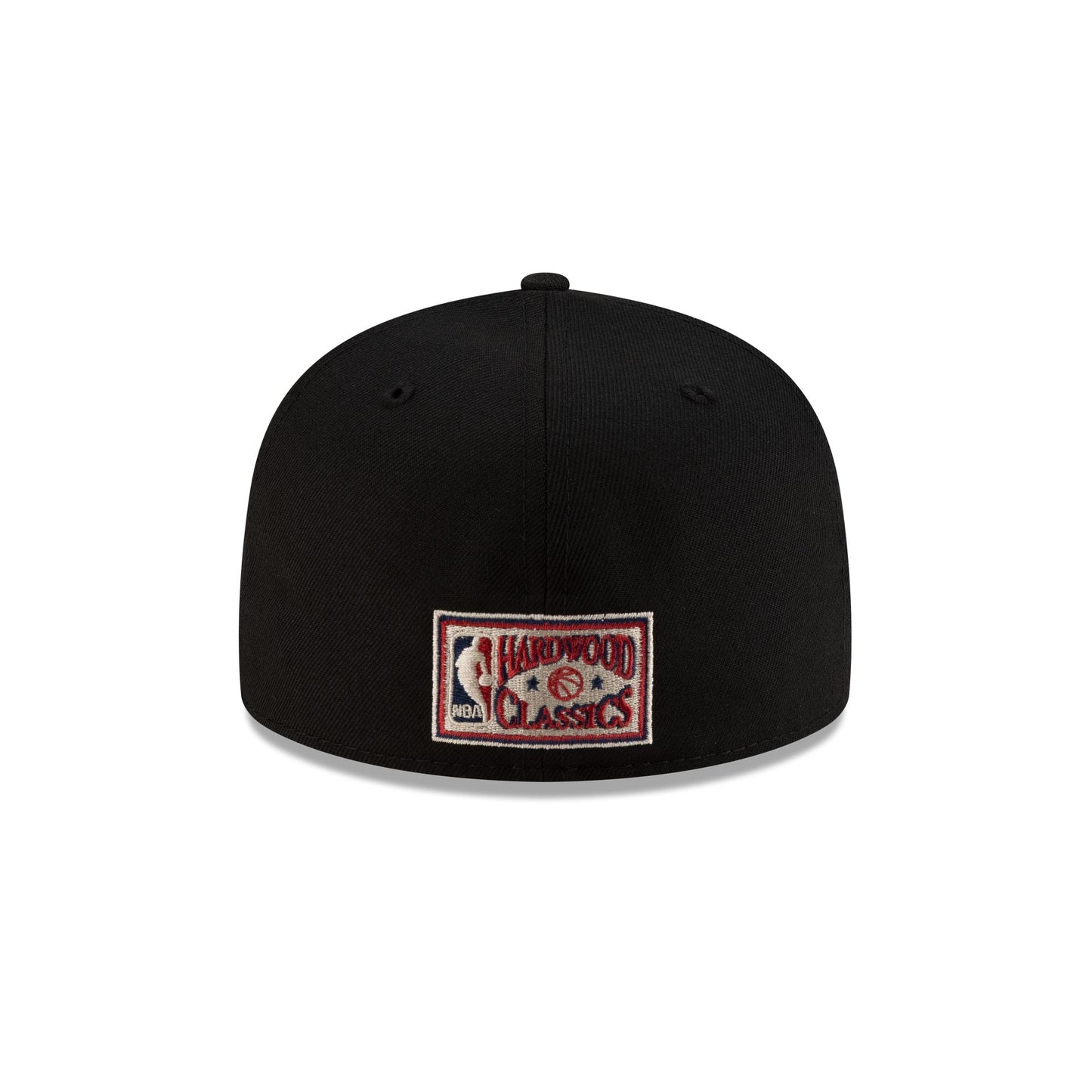 The San Antonio Spurs 1989-2001 Hardwood Classics Black 59FIFTY Fitted Cap features an embroidered vintage Spurs logo at the front panels with a 1996 NBA All-Star Weekend patch at the right-wear side. Additional details include a Hardwood Classics