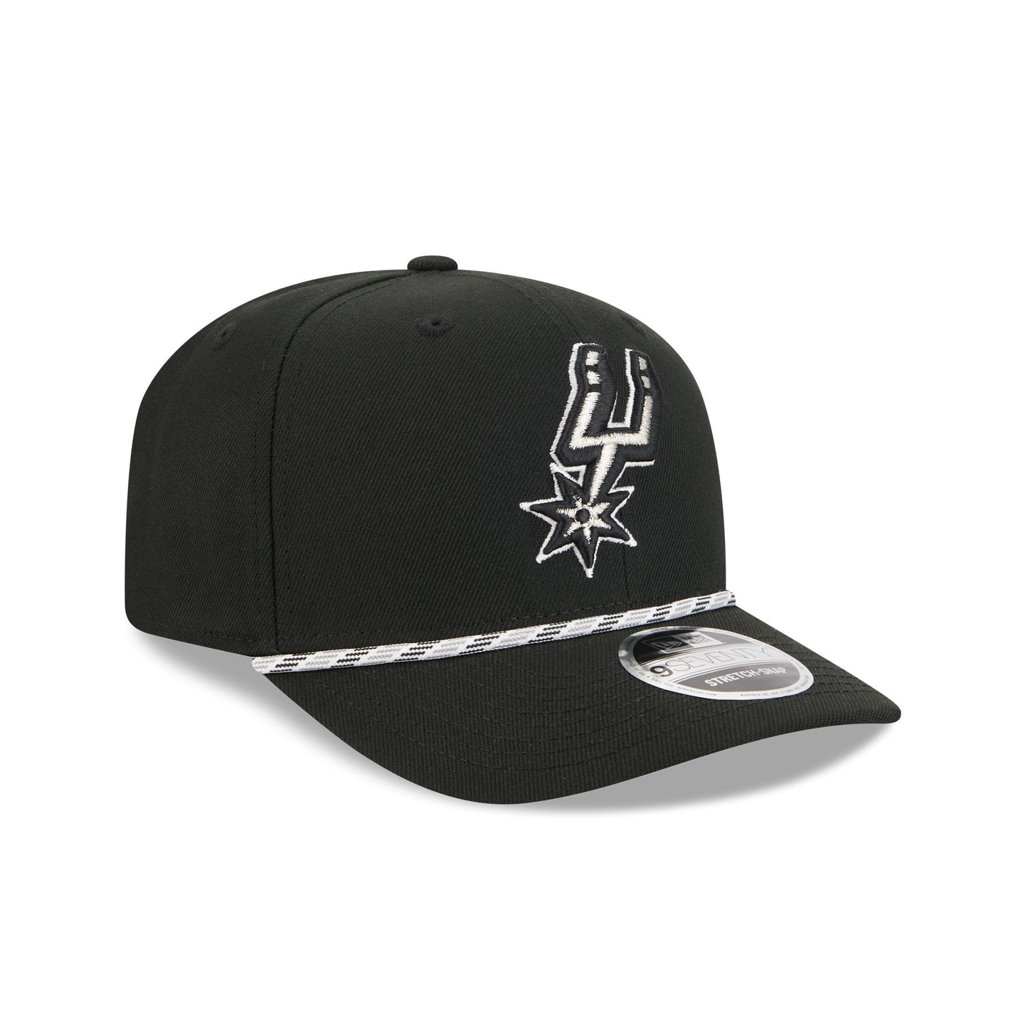 The San Antonio Spurs Multicolor Rope 9SEVENTY Stretch-Snap features an embroidered Spurs logo at the front panels with a rope at the visor and an adjustable stretch-snap closure at the rear.