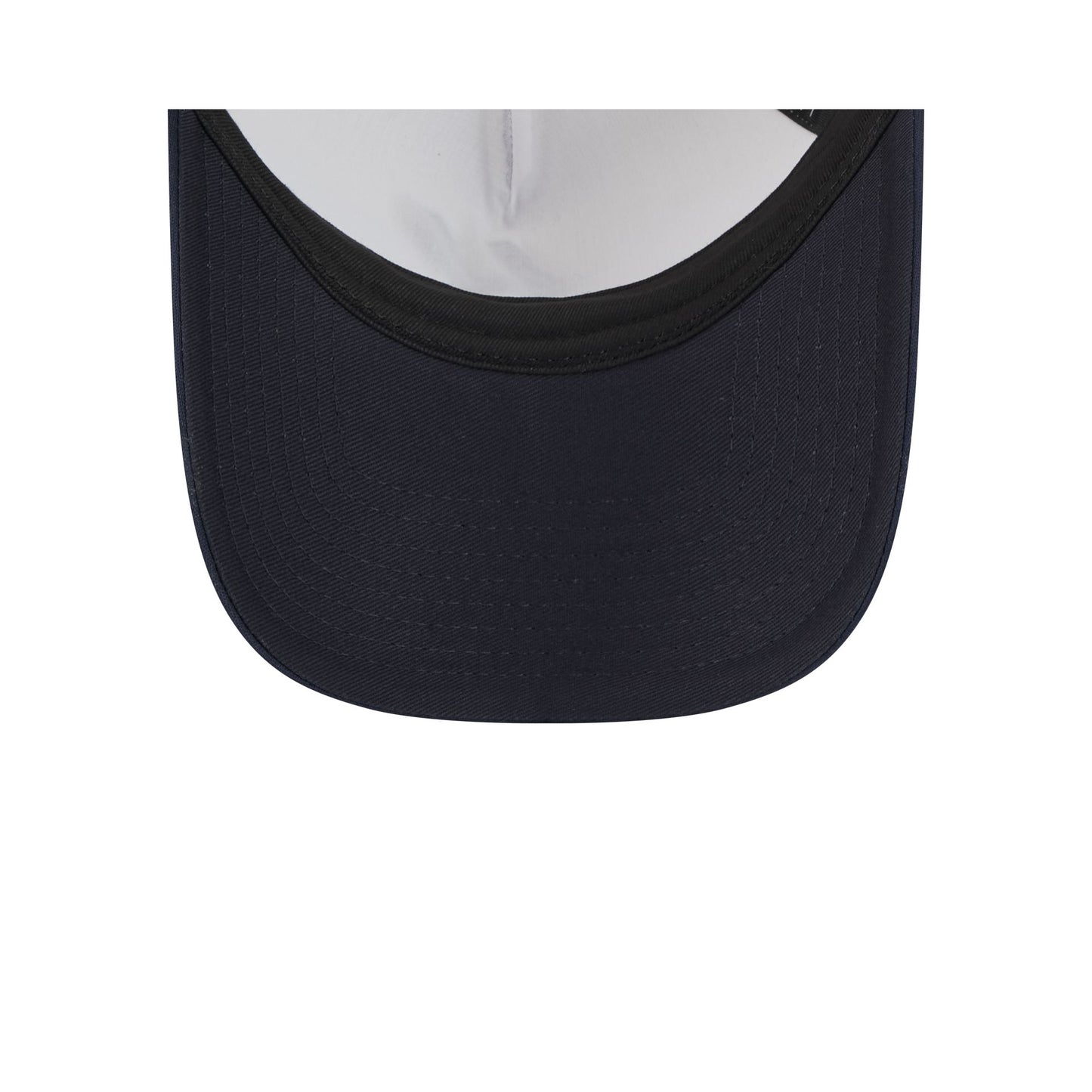 The San Antonio Spurs Navy Purple 9FORTY A-Frame Trucker features an embroidered Spurs logo at the front panels with a snapback closure at a mesh rear.