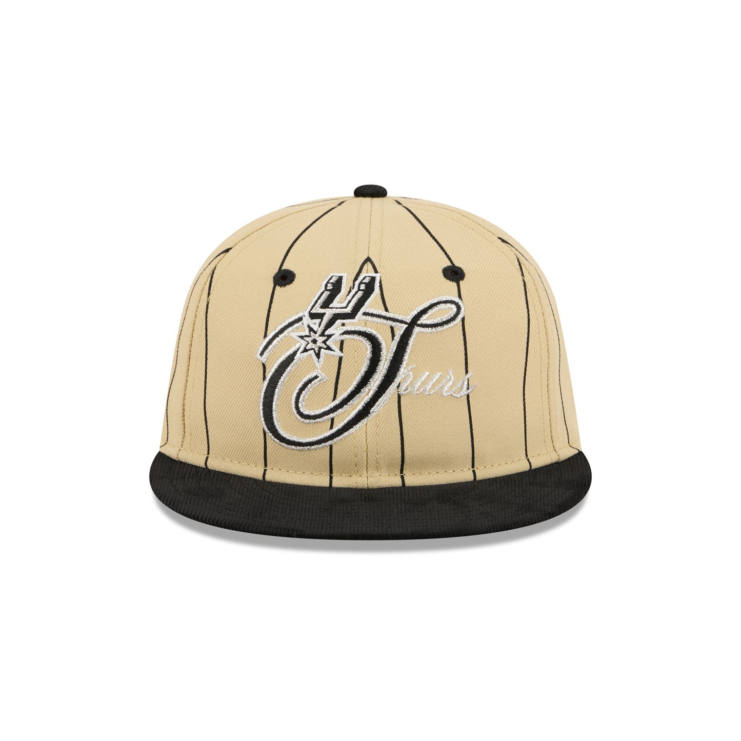 The San Antonio Spurs Pinstripe Script Retro Crown 9FIFTY Adjustable Cap features an embroidered Spurs logo and cursive wordmark at the front panels wit an adjustable belt closure at the rear and a green undervisor.