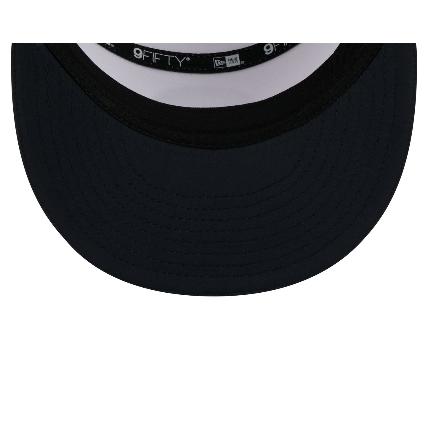 The San Diego FC 2026 MLS Kickoff Split Panel 9FIFTY Snapback features a stitch-down silicone San Diego FC logo patch at the front panel with a matching woven MLS Shield tag above a snapback closure at the rear. Additional details include a quill tech performance fabrication with a navy visor accented with team color stripes at the front.