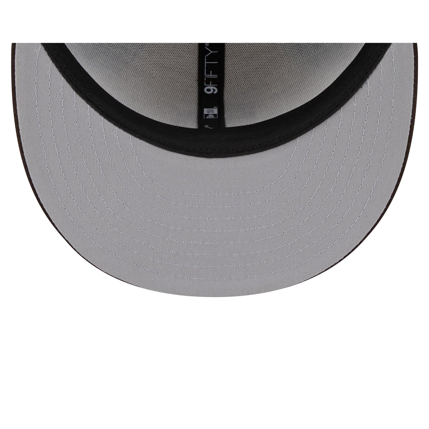 The San Diego Padres 2025 Batting Practice 9FIFTY Snapback features an embroidered Padres logo at the front panels with a matching snapback closure at the rear. Additional details include a pivot knit fabrication, a brown visor, and a gray undervisor.